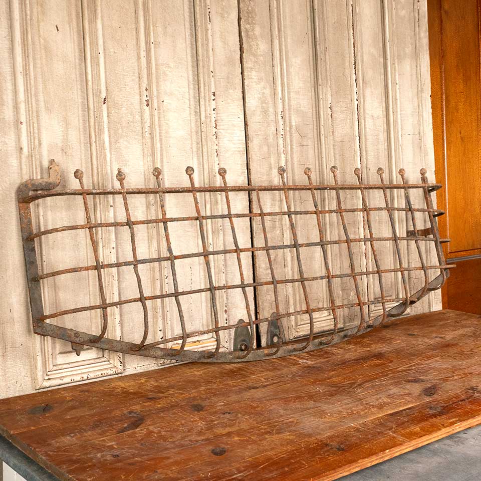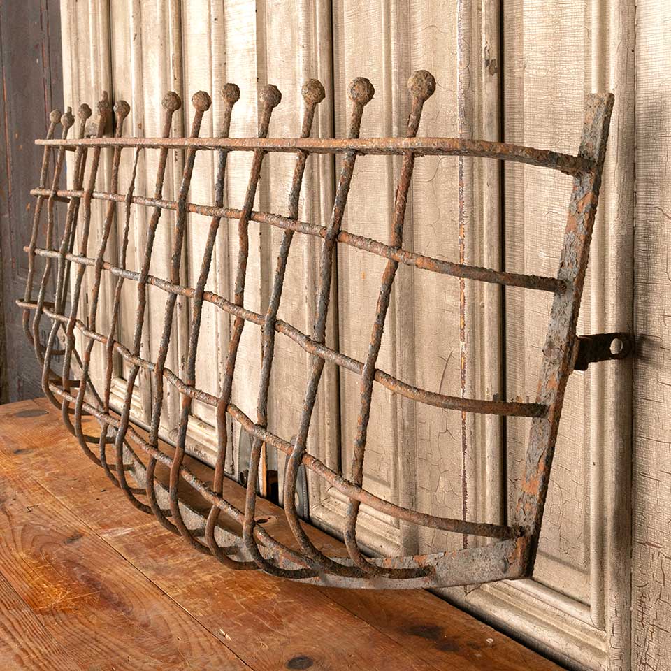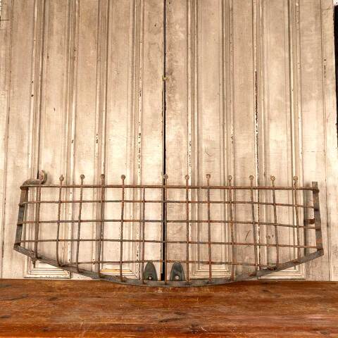 Architectural salvage antique wrought iron window grate cover measuring approx. 61" wide x 21 1/2" tall x 4" front to back. See photos to evaluate condition.