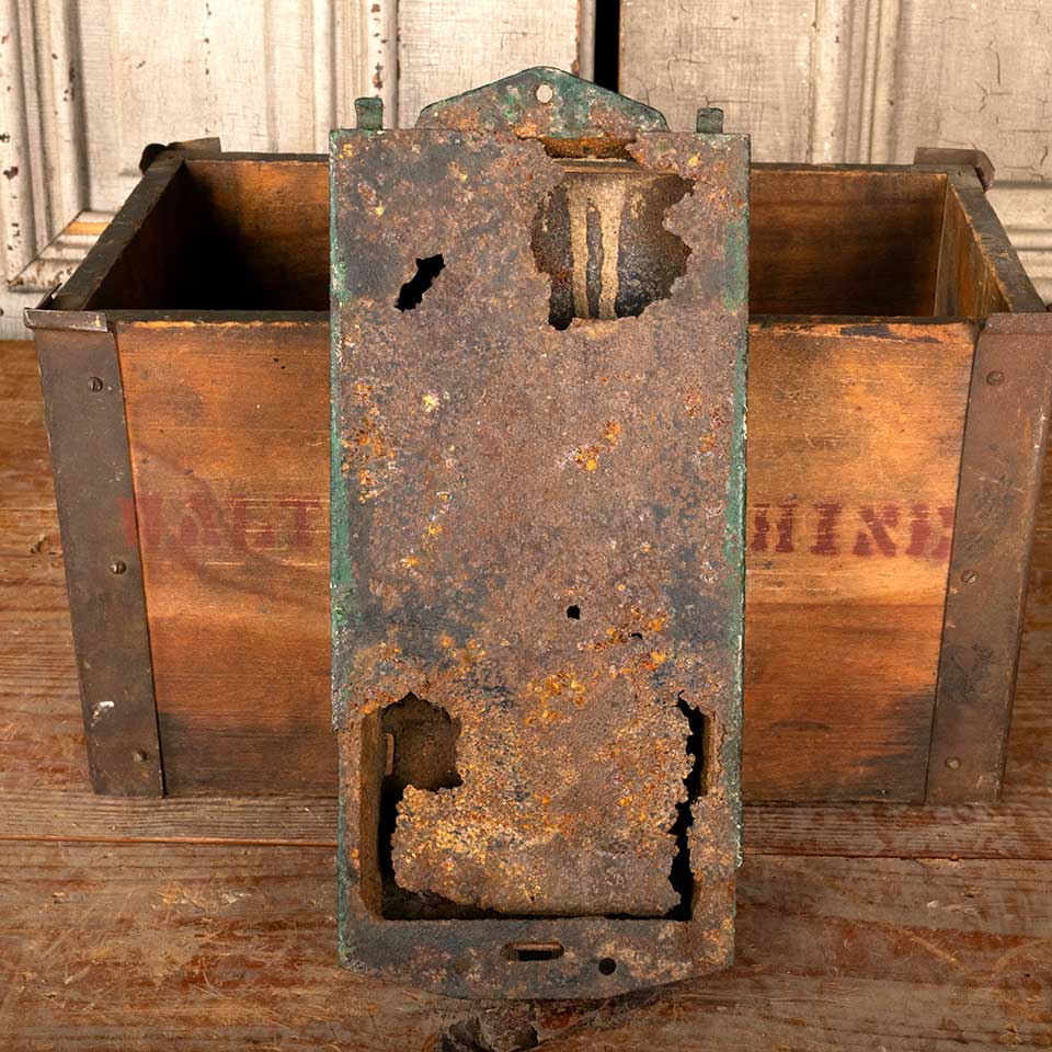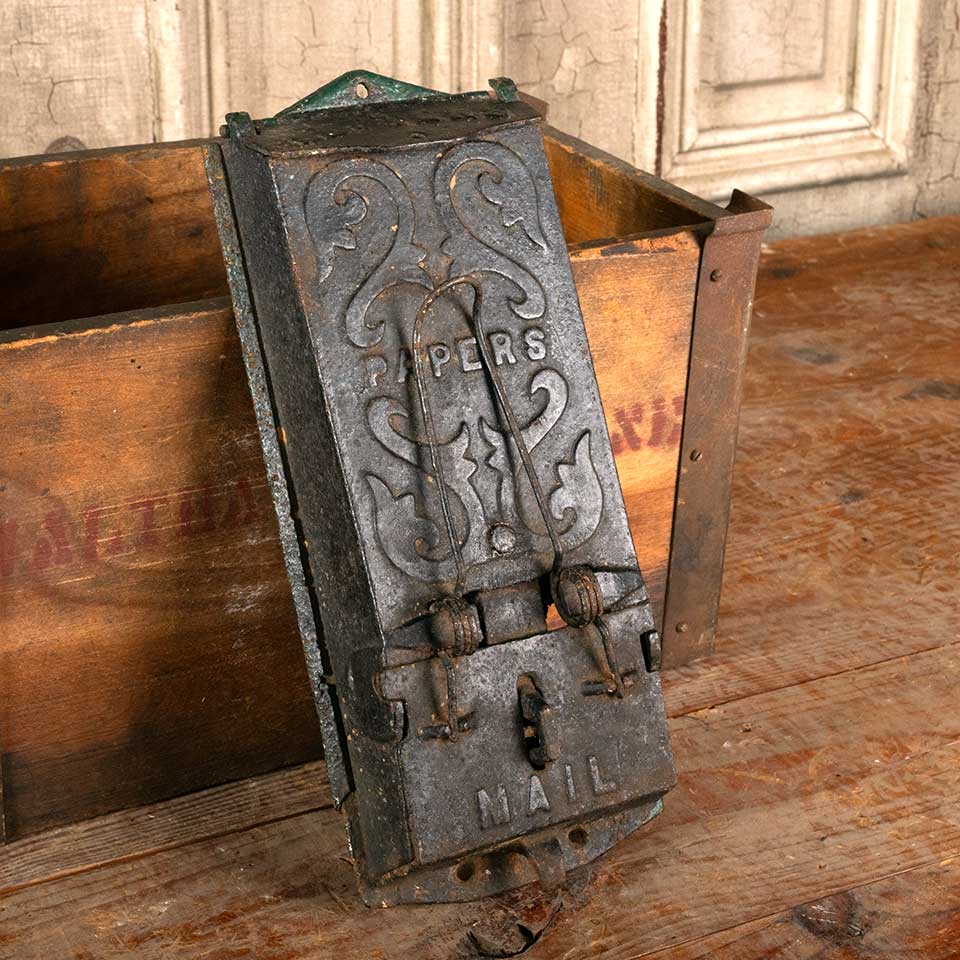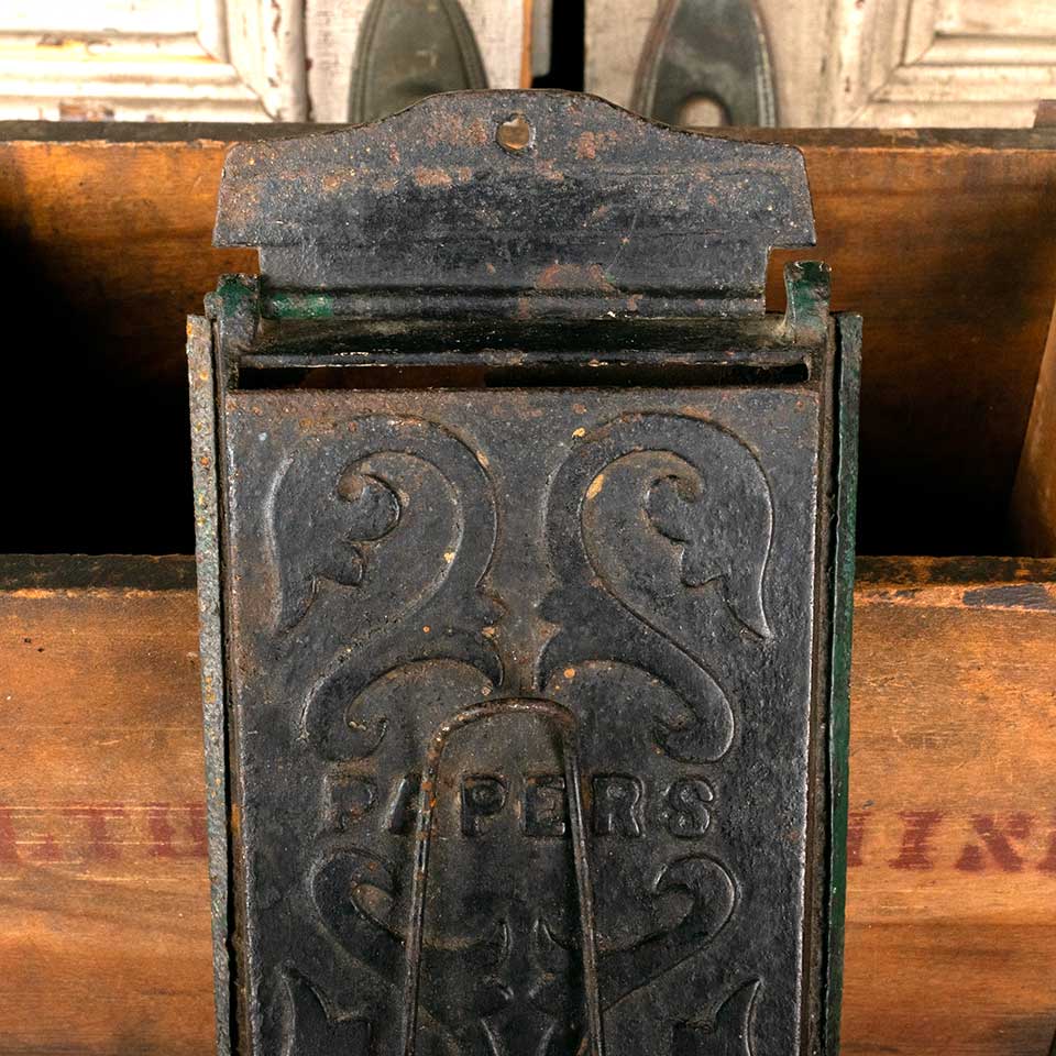 Architectural salvage antique cast iron mailbox with PAPERS holder measuring approx. 5 1/4" wide x 12 1/4" tall x 2" front to back. The lid tab is broken off on one side and it's rusted through on the back. See photos to evaluate condition.