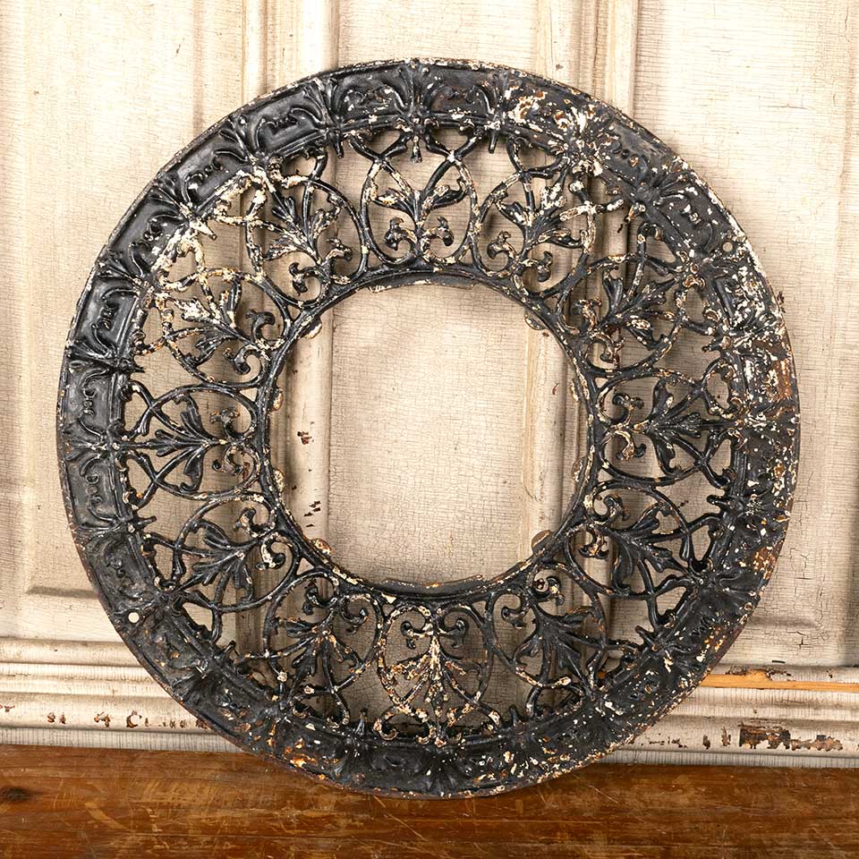 Architectural salvage antique round ornate cast iron heat grate vent cover measuring approx. 15 7/8" in diameter (with a 6 3/4” diameter interior opening) x 1/2" front to back. See photos to evaluate condition.