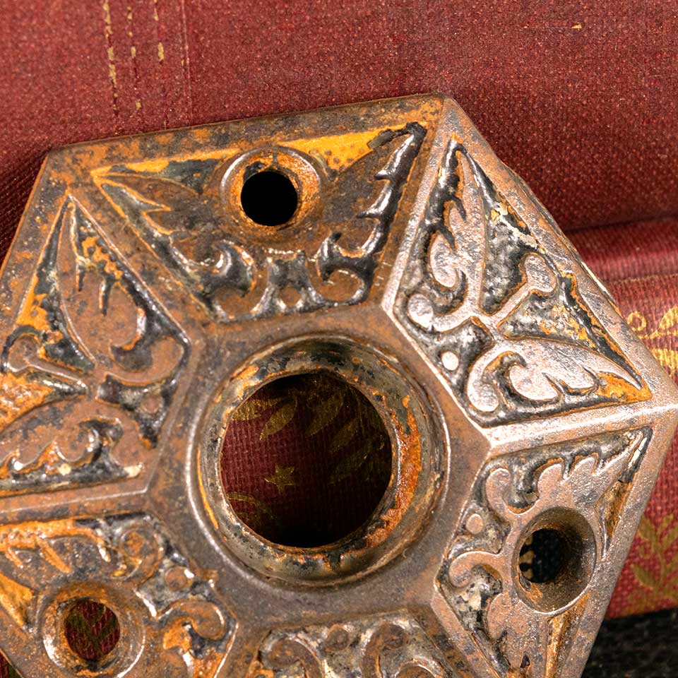 Architectural salvage antique Victorian Eastlake patterned hexagonal cast iron doorknob rosette escutcheon door hardware measuring approx. 2 1/8" in diameter with a 3/4" diameter collar. Color and condition vary, see photos to evaluate condition. Priced at $25/each.