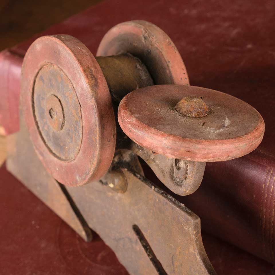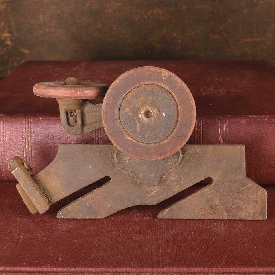 Architectural salvage antique pocket door roller / hanger hardware measuring approx. 6" wide x 3 5/8" tall x 1 5/8" front to back with 2 1/8" diameter wheel. Color and condition may vary, see photos to evaluate. Priced at $65/each.
