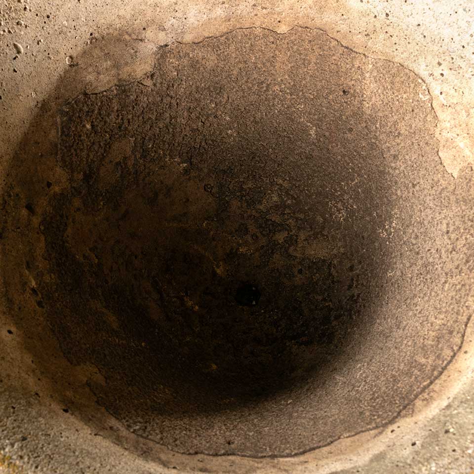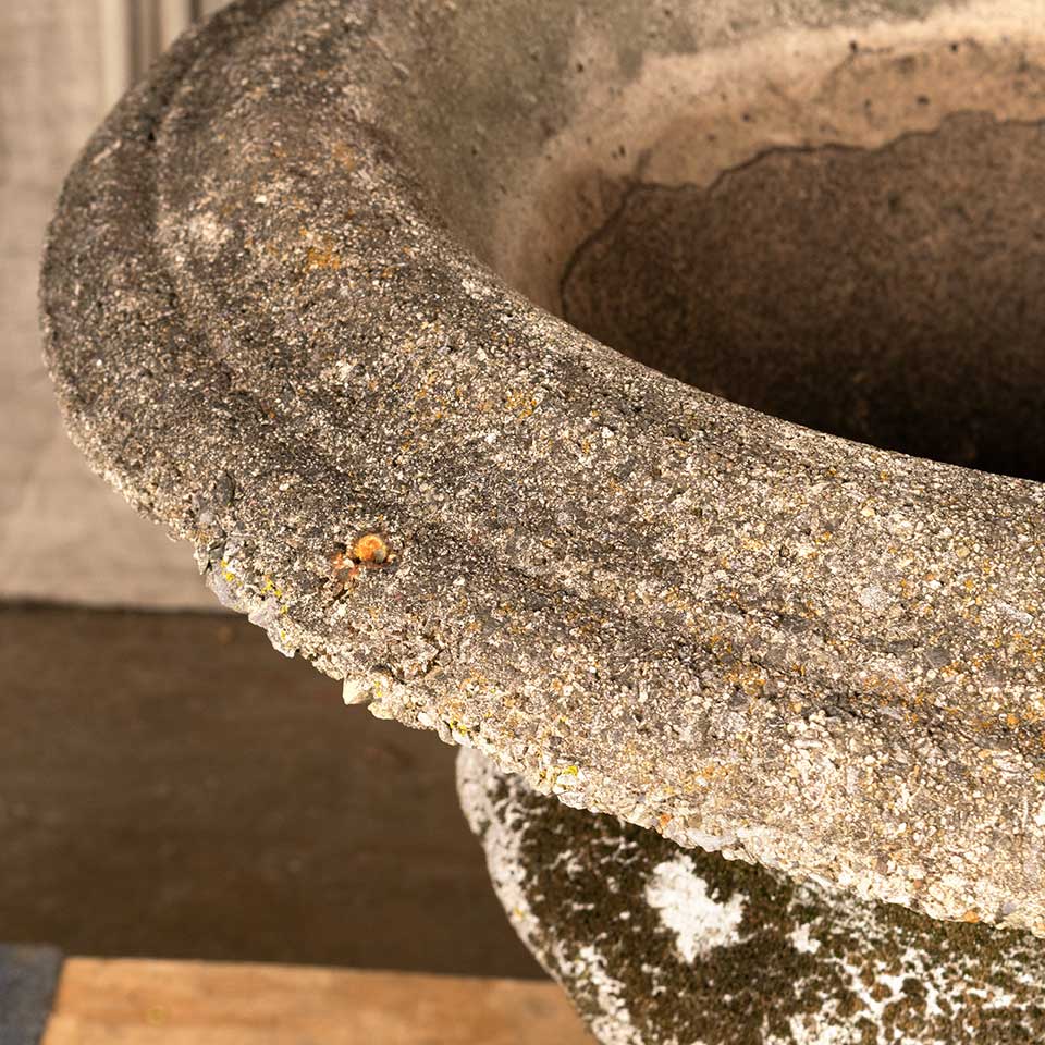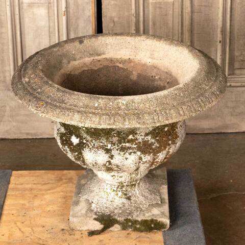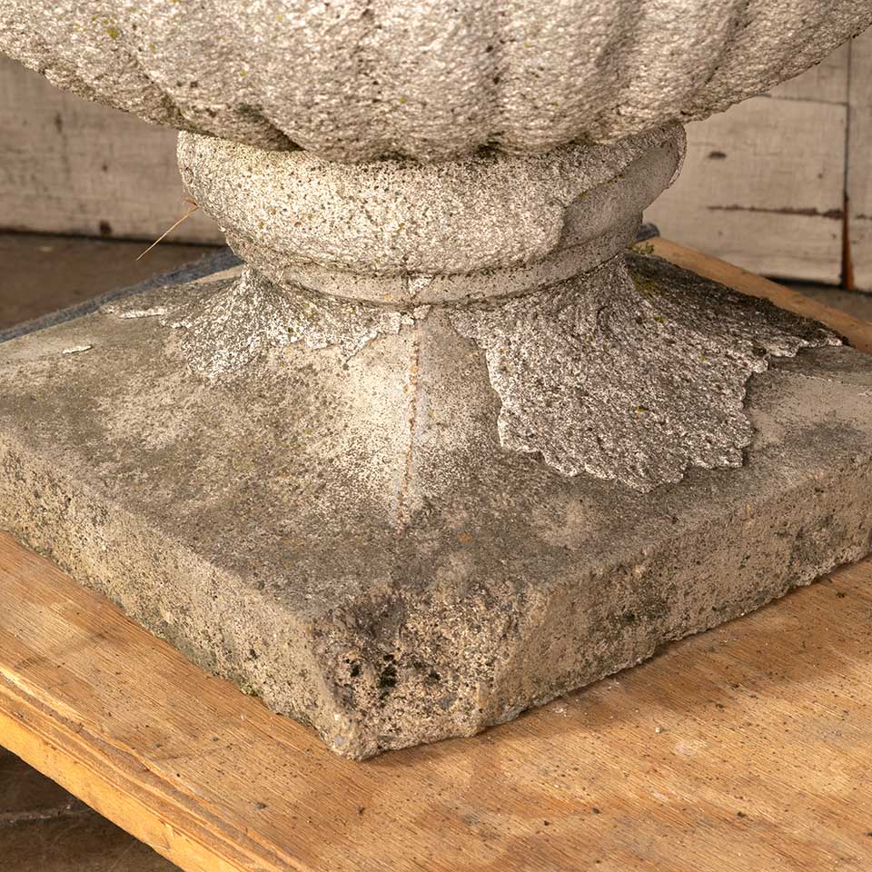 Architectural salvage vintage concrete garden planter urn measuring approx. 25" in diameter x 19 1/2" tall with a 12" square base. One corner of the base is chipped. See photos to evaluate condition.