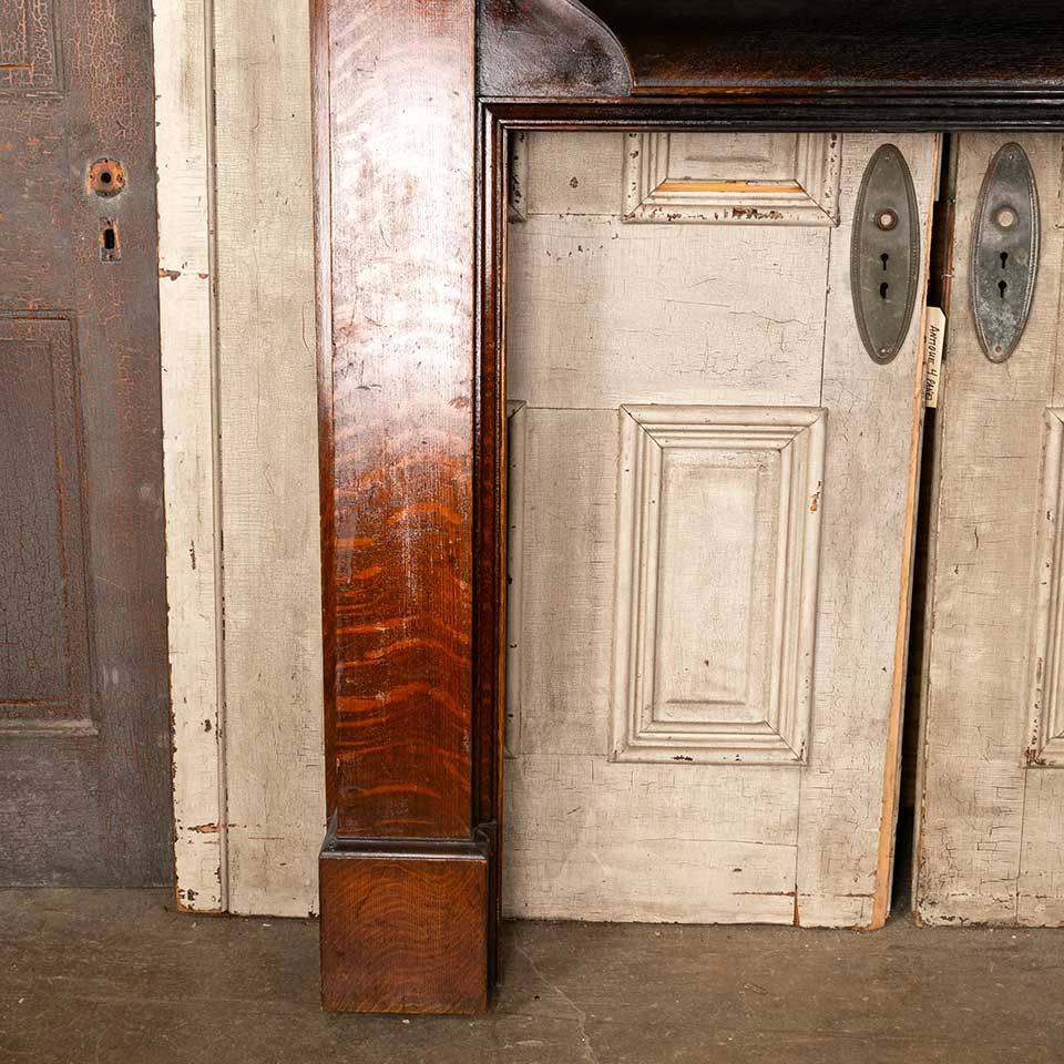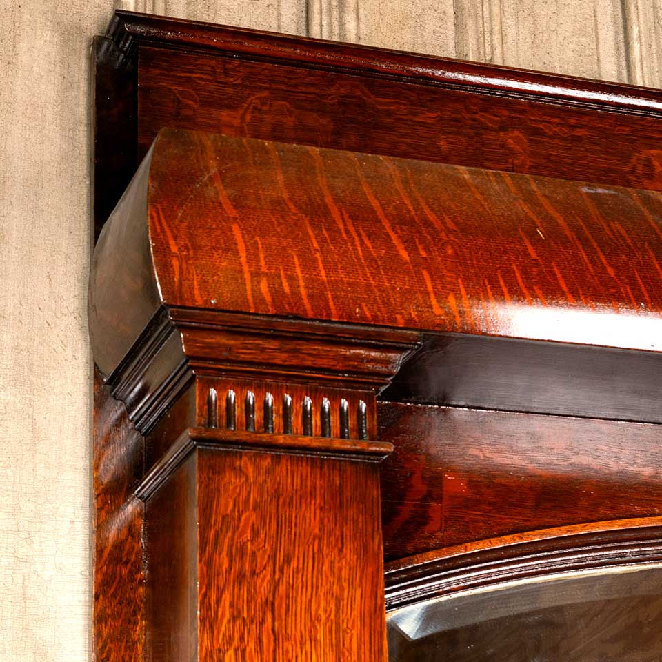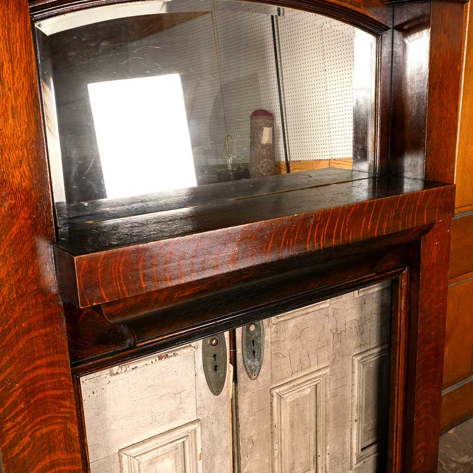 Architectural salvage antique oak fireplace mantel / mantle with arched top beveled glass mirror measuring approx. 59 1/4" wide x 88 1/2" tall x 11 1/2" front to back. The interior firebox opening measures approx. 41 1/4" wide x 38 7/8" tall. See photos to evaluate condition.