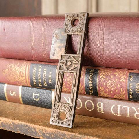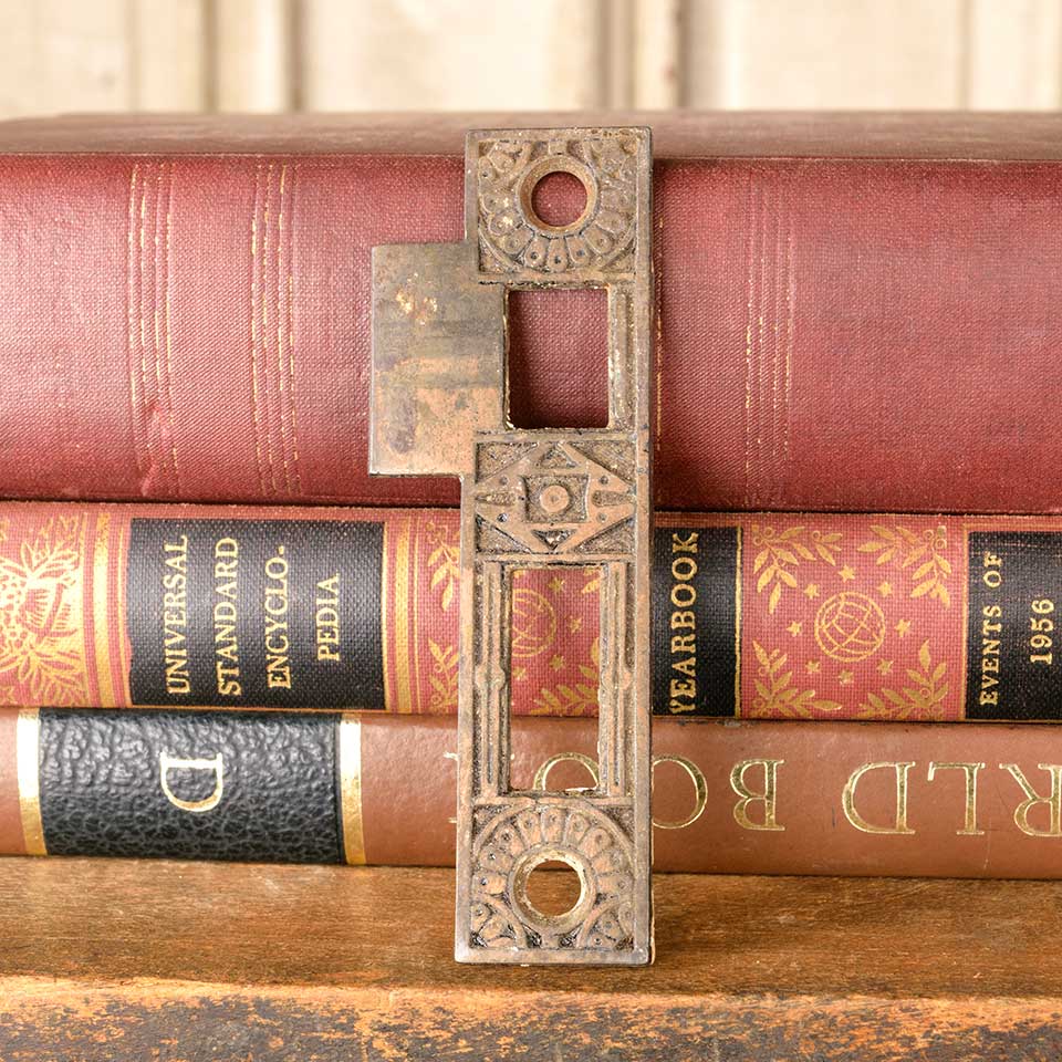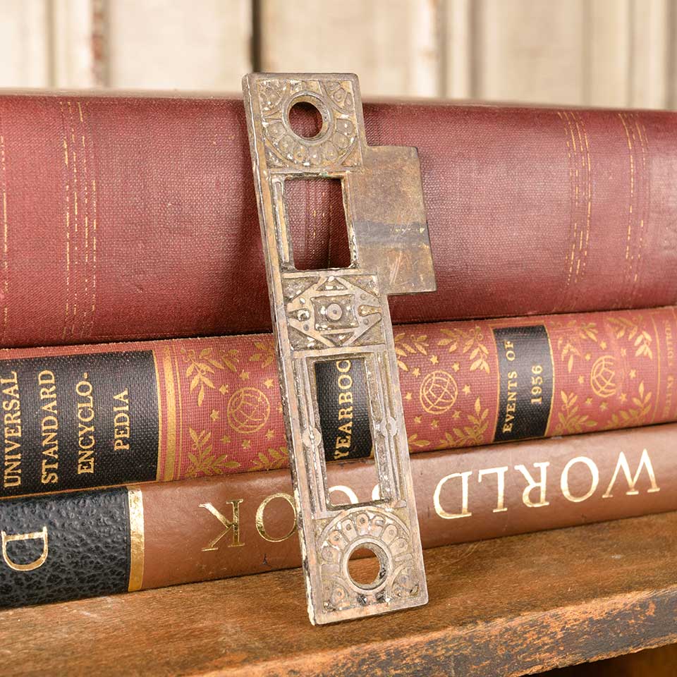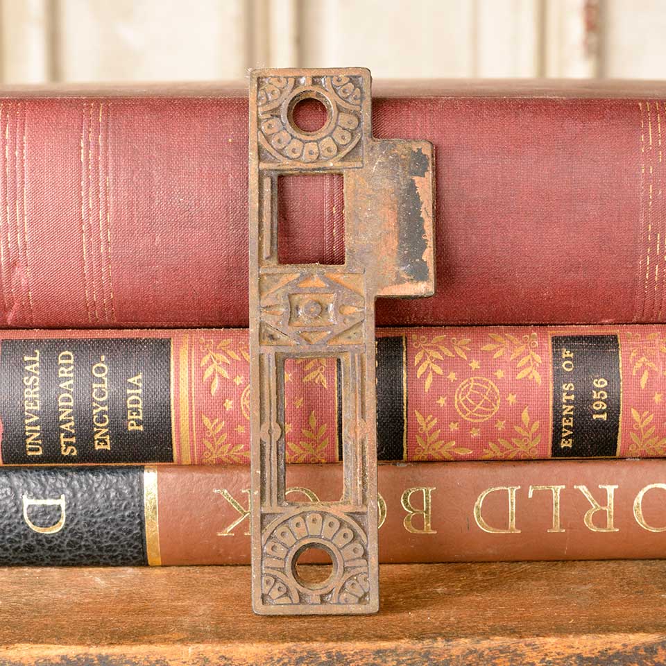 Architectural salvage antique ornate Victorian cast iron door strike plate hardware with Eastlake patterns measuring approx. 1" wide x 4" tall x 1/8" thick with a tongue projection of 7/16". The distance between latch and deadbolt cutouts measures 3/4". Latch cutout measures 9/16" wide x 3/4" tall and deadbolt cutout measures 1/2" wide x 1 1/8" tall. Color and condition may vary.