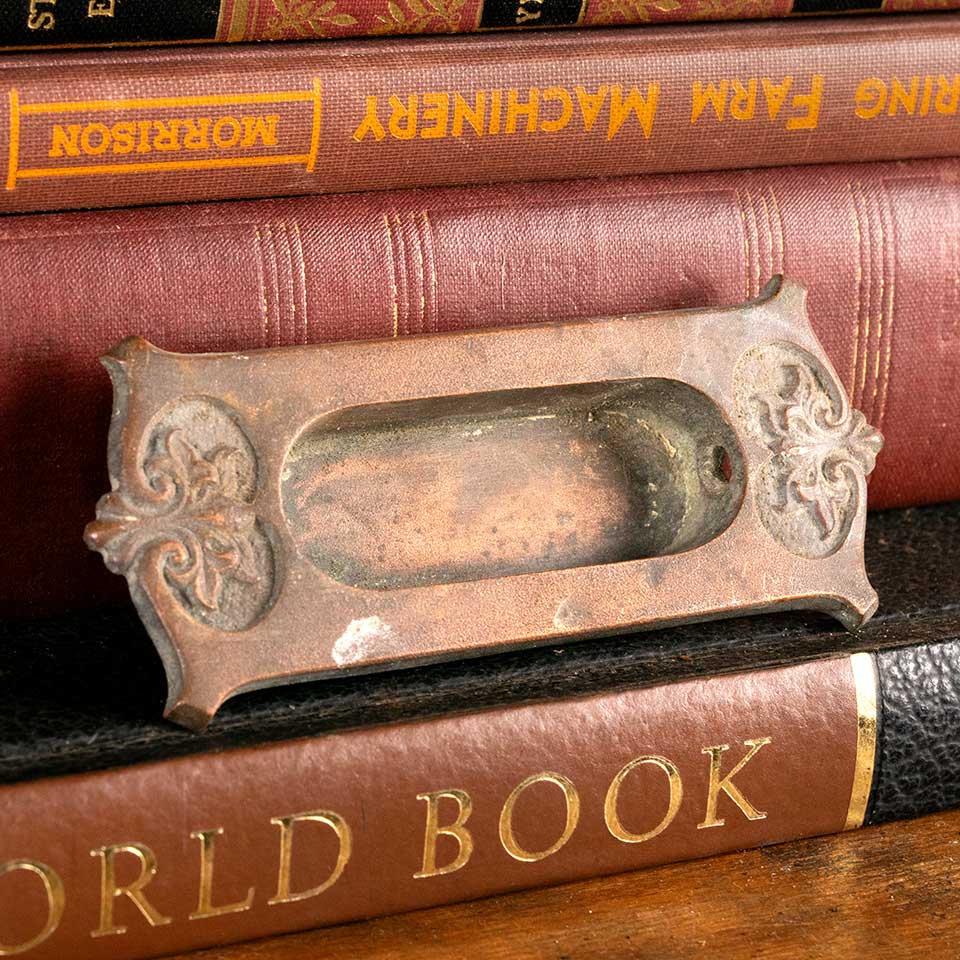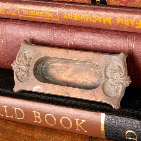 Architectural salvage antique ornate bronze window sash lift hardware measuring approx. 3 7/8" wide x 1 5/8" tall x 1/2" front to back. The recessed area measures approx. 2 3/8" wide x 7/8" tall. Color and condition vary, see photos to evaluate. Priced at $45/each.