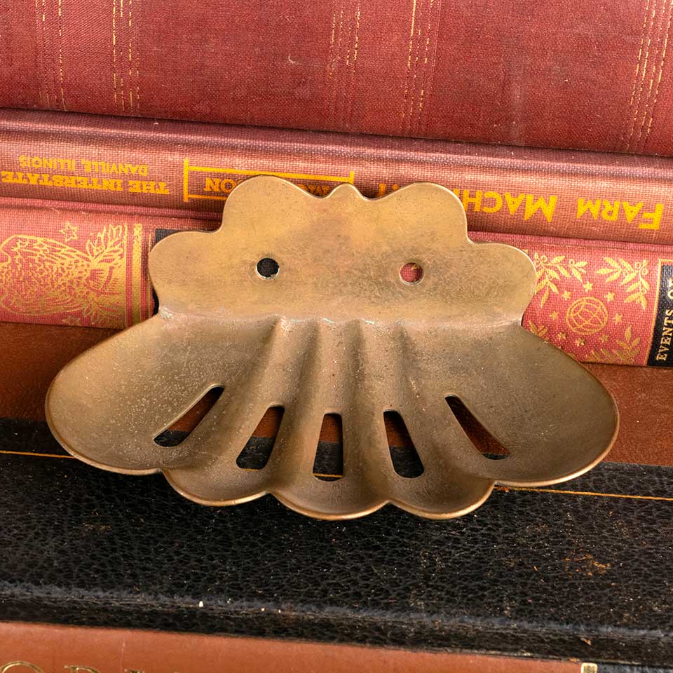 Architectural salvage antique brass scalloped shell wall mount soap dish measuring approx. 4 3/8" wide x 1 3/4" x 3 1/8" front to back. See photos to evaluate condition.