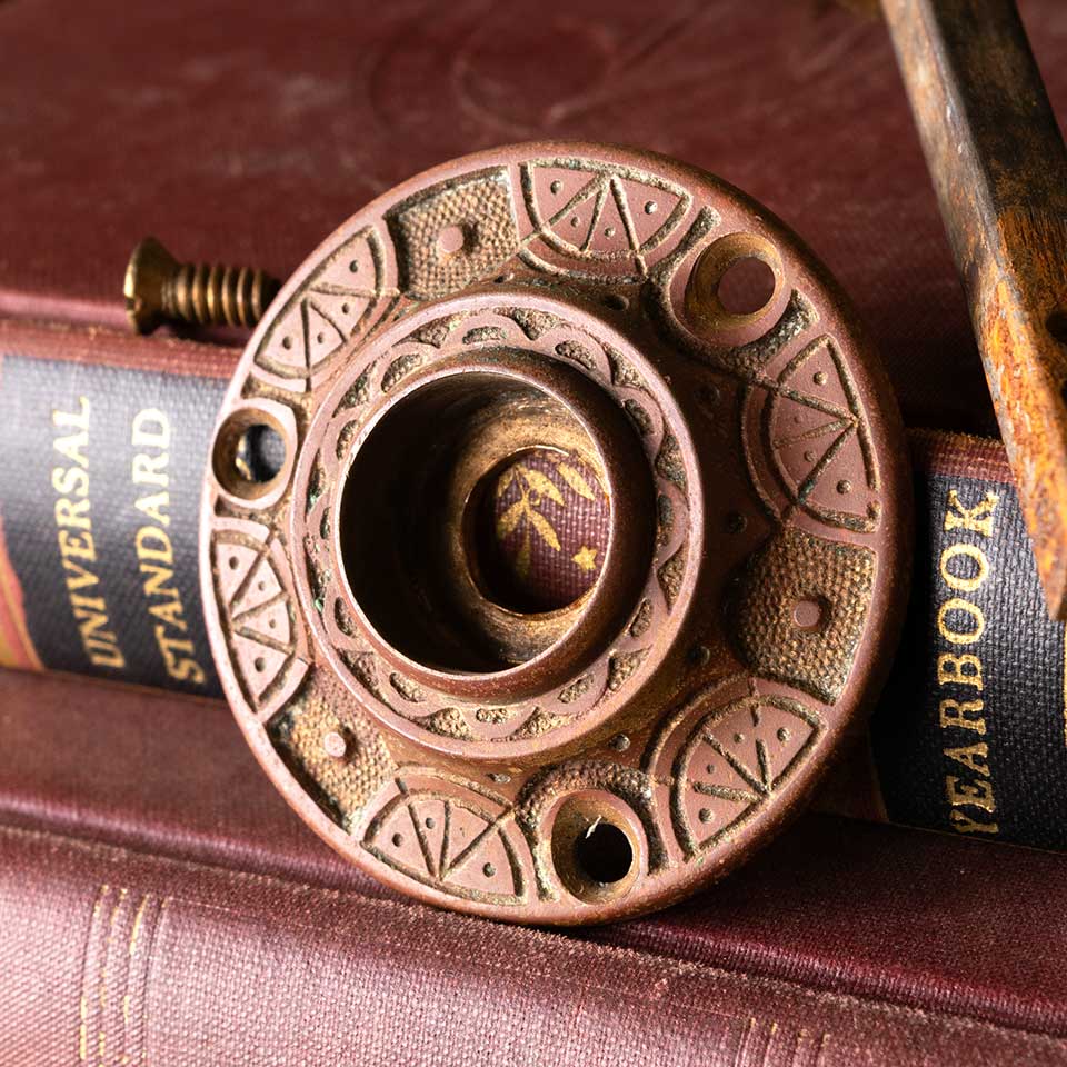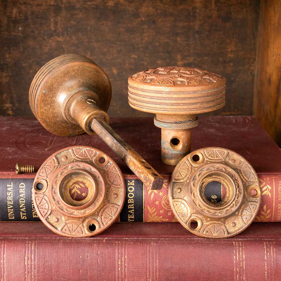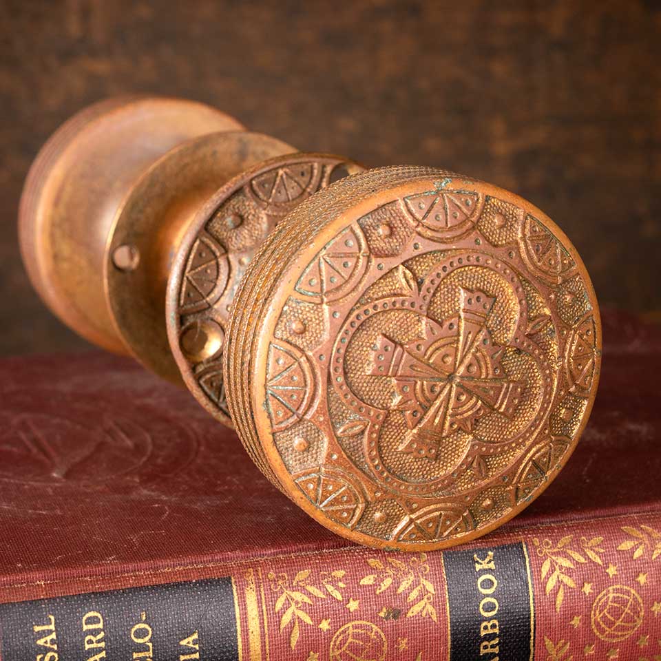 Architectural salvage antique solid bronze Nimick & Brittan Mfg. Co. Maltese pattern c. 1883 door hardware set. The set includes two doorknobs (2 1/4" in diameter); two matching rosettes (2" in diameter); and a tapped spindle with set screws. See photos to evaluate condition. Priced at $250 for the set.