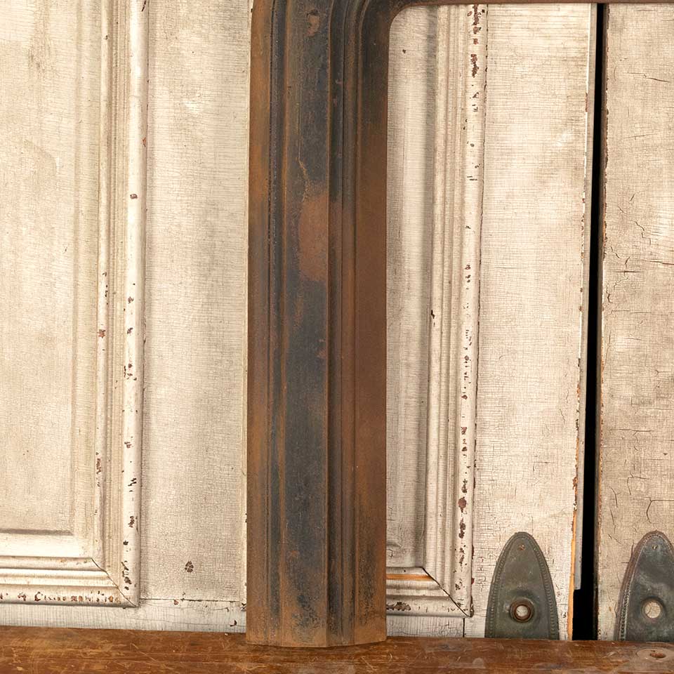 Architectural salvage antique cast iron fireplace surround with rounded corners measuring approx. 30" wide x 32" tall x 2 1/2" front to back. The interior opening measures approx. 19" wide x 26" tall. See photos to evaluate condition.