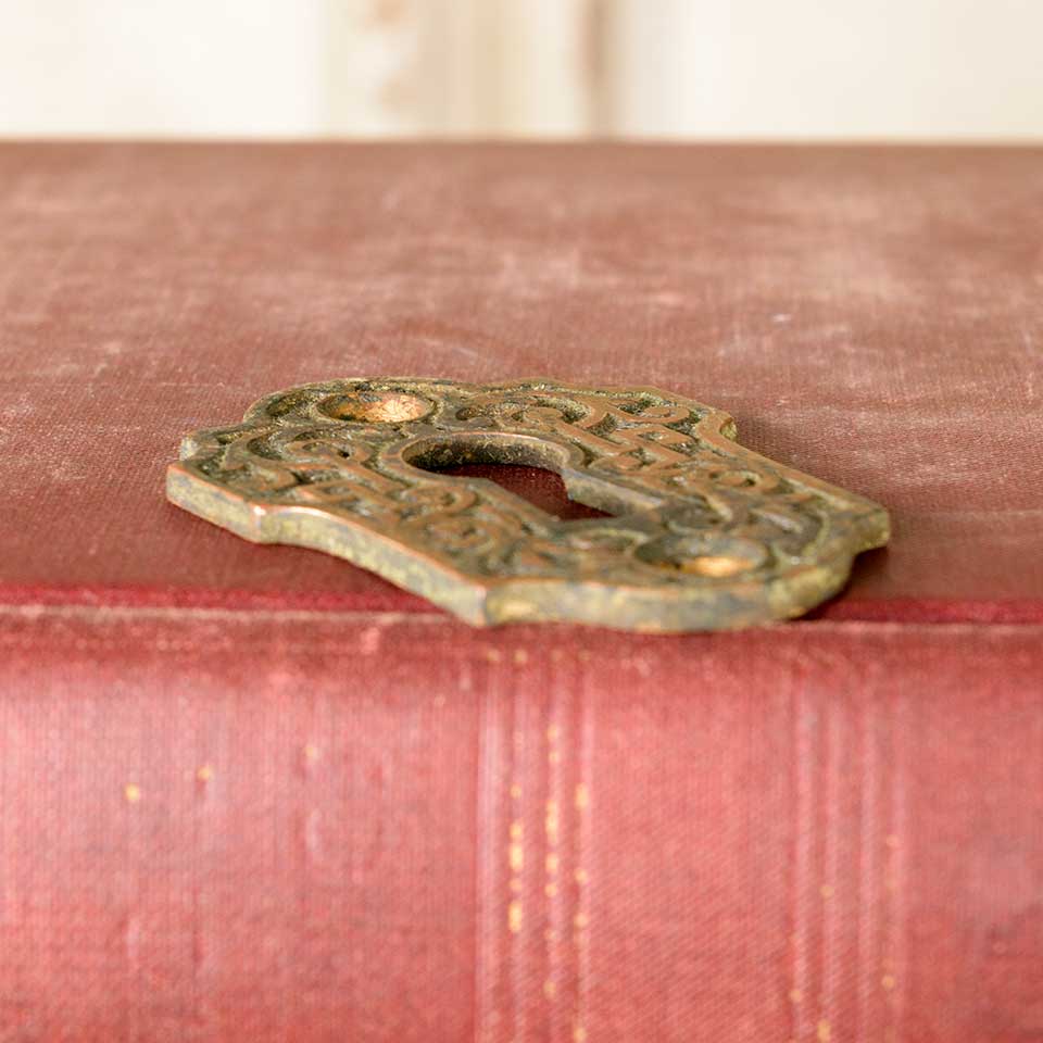 Architectural salvage ornate antique bronze skeleton keyhole escutcheon cover plate door hardware measuring approx. 1 3/8" wide x 1 7/8" tall x 1/16" thick. See photos to evaluate condition.