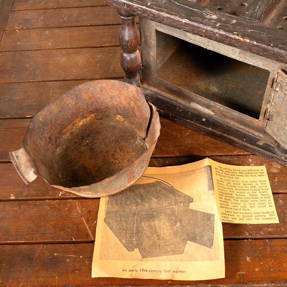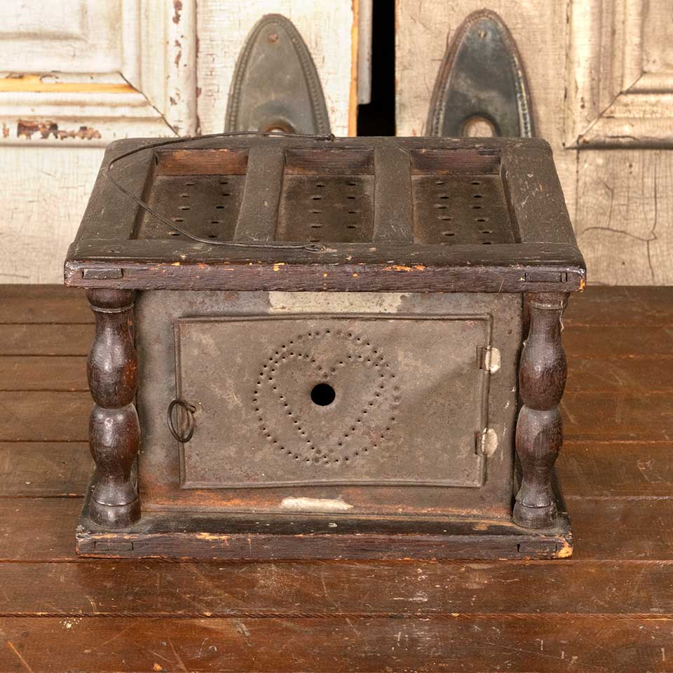 Antique early 19th century primitive wood and metal foot warmer with pierced tin heart motif measuring approx. 9" wide x 5 3/4" tall x 7 3/4" front to back. See photos to evaluate condition.