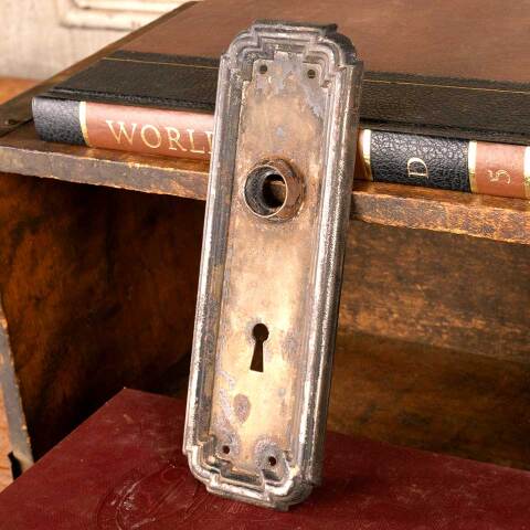 Architectural salvage antique Arts & Crafts metal doorknob backplate hardware measuring approx. 2 1/2" wide x 7 1/2" tall with a 3/4" diameter collar. The spindle and keyhole measure 2 1/2" on centers. Condition and color may vary, see photos to evaluate. Priced at $20/each.