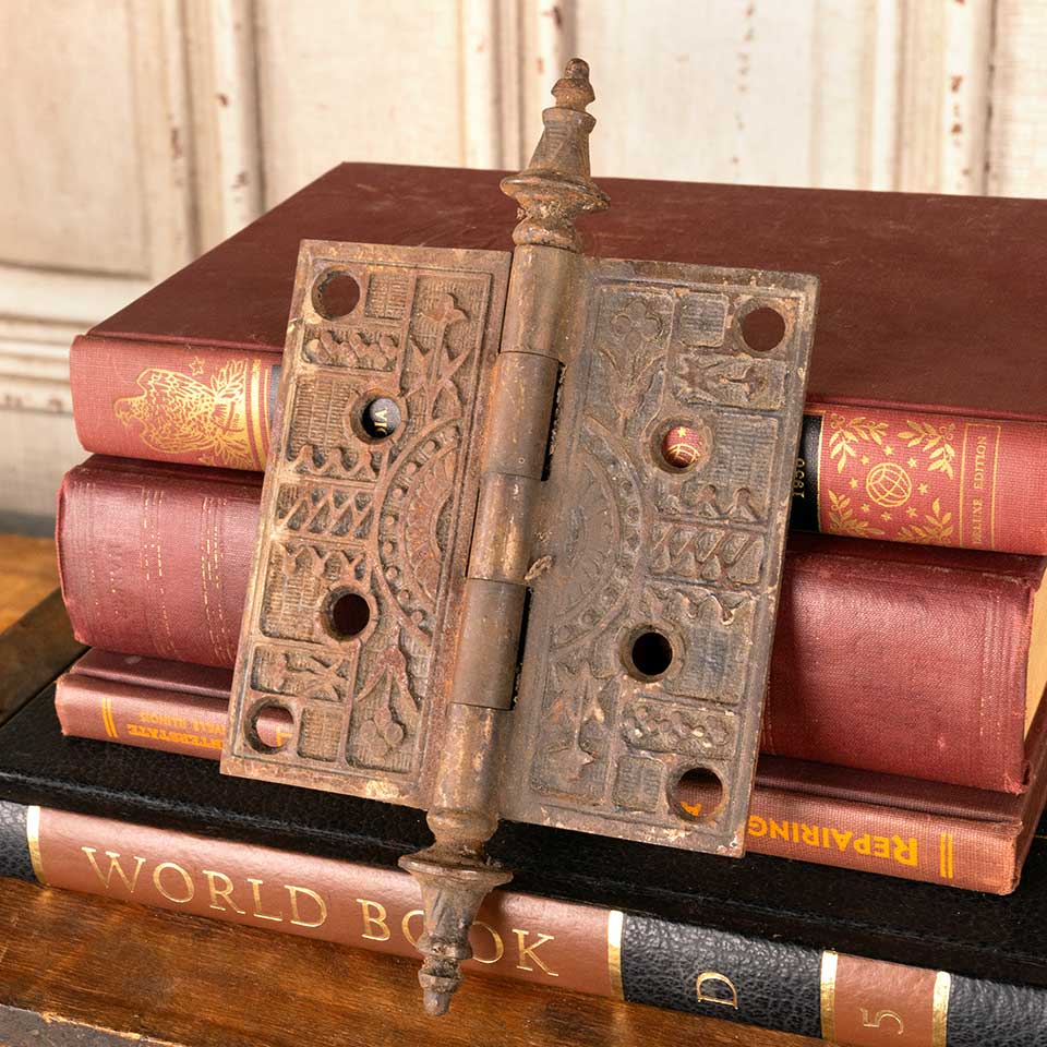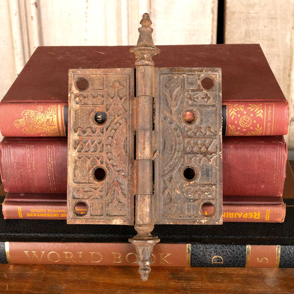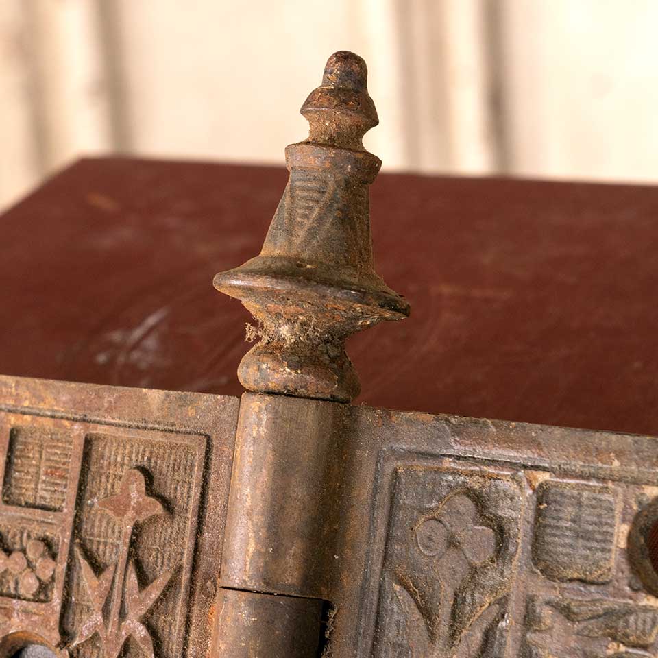 Architectural salvage antique Victorian Eastlake cast iron steeple finial door hinge hardware measuring approx. 4 1/2" square (7 3/4" tall including finials). See photos to evaluate condition.