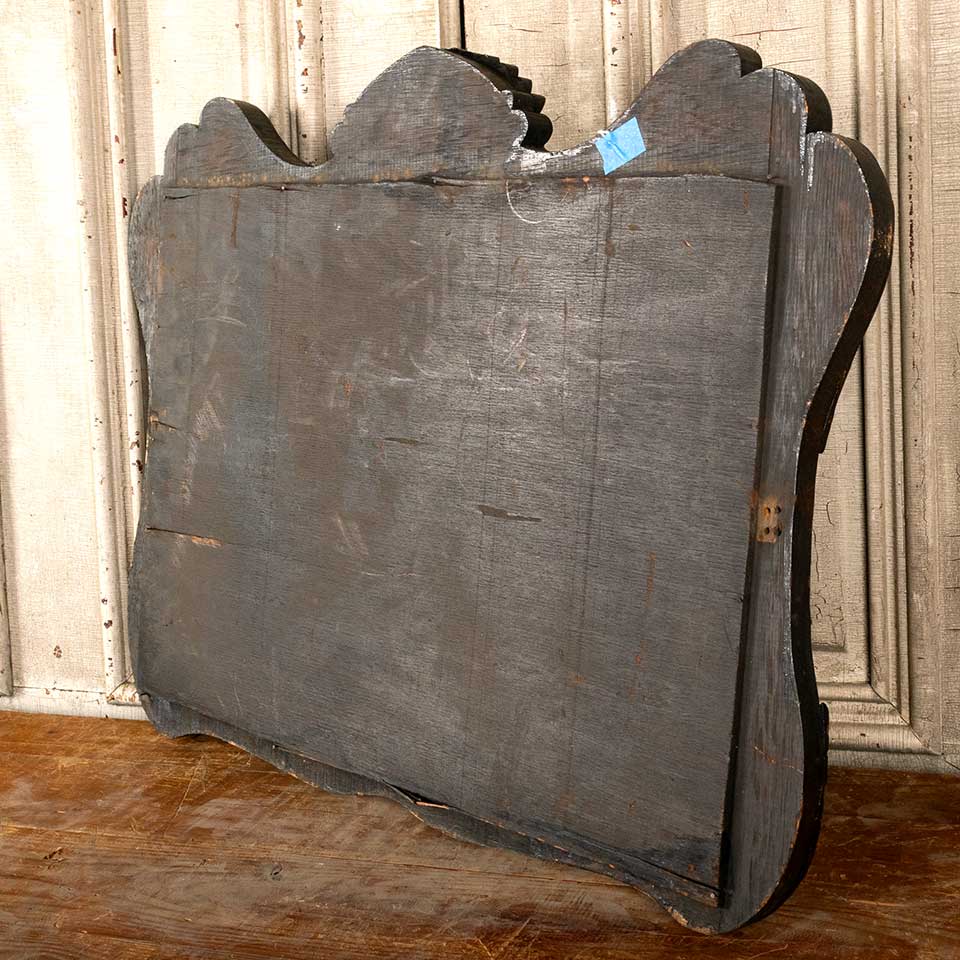 Architectural salvage antique beveled glass mirror in wood frame measuring approx. 30" wide x 23" tall x 1 3/4" front to back. See photos to evaluate condition.