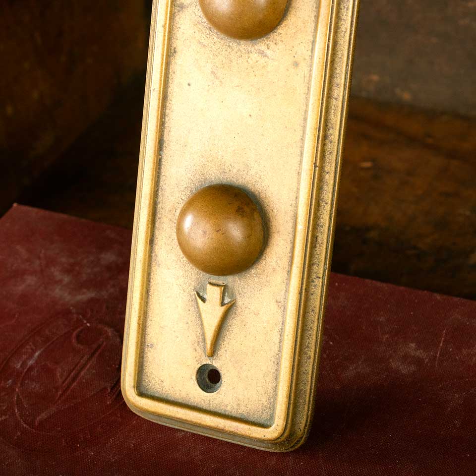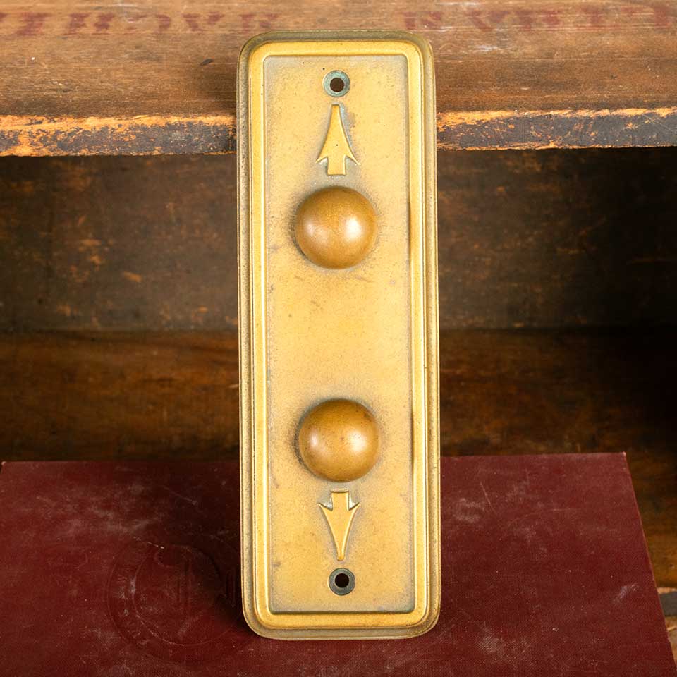 Architectural salvage antique cast bronze elevator up and down arrow button push plate measuring approx. 2 3/8" wide x 7 1/4" tall x 1 1/8" front to back with buttons measuring approx. 2 5/8" on center. Serial number on back 2594SW1. See photos to evaluate condition.