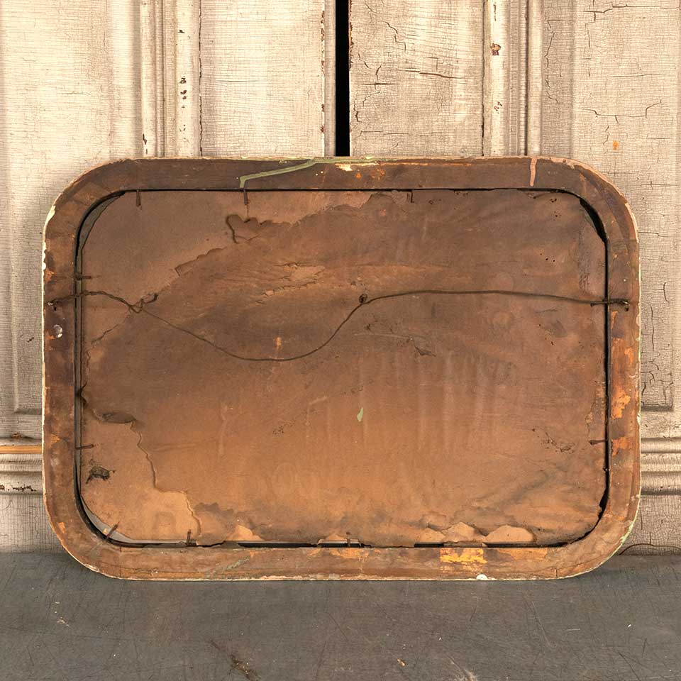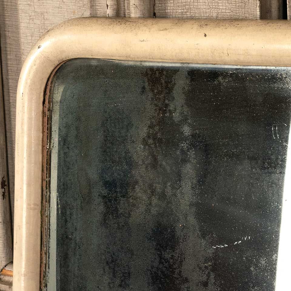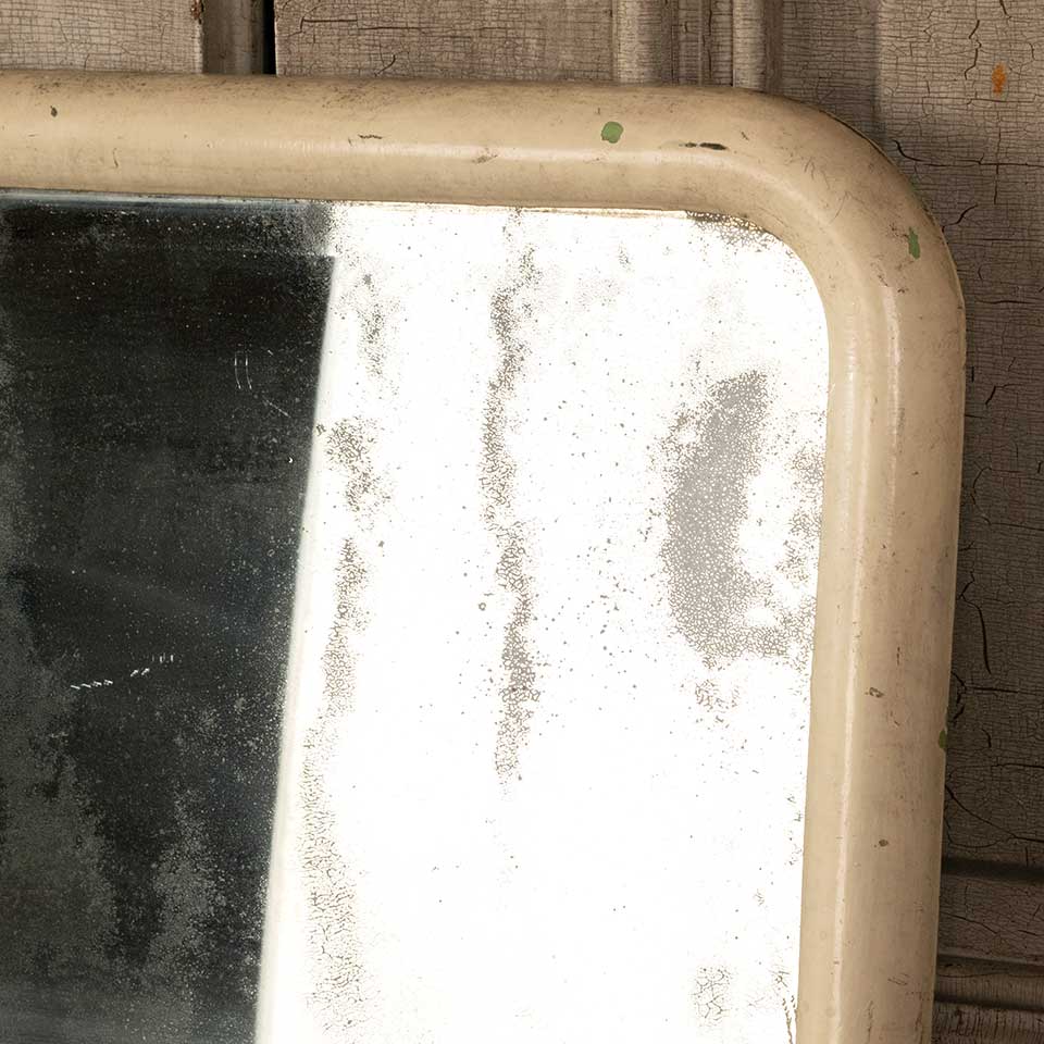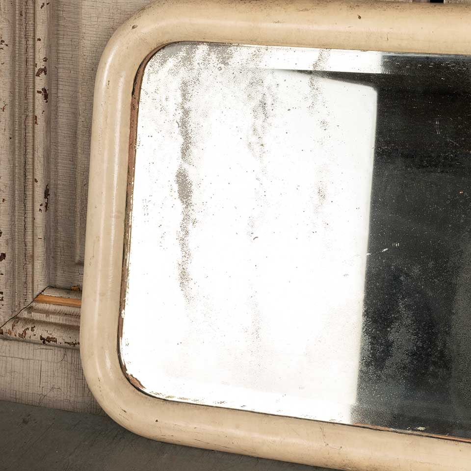 Antique beveled glass mirror in painted wood frame with round corners measuring approx. 20 3/8" wide x 14 3/8" tall x 1" front to back. See photos to evaluate condition.