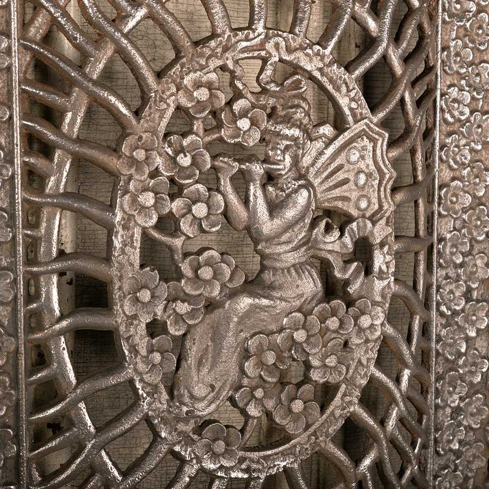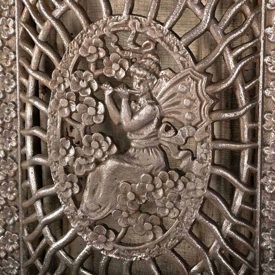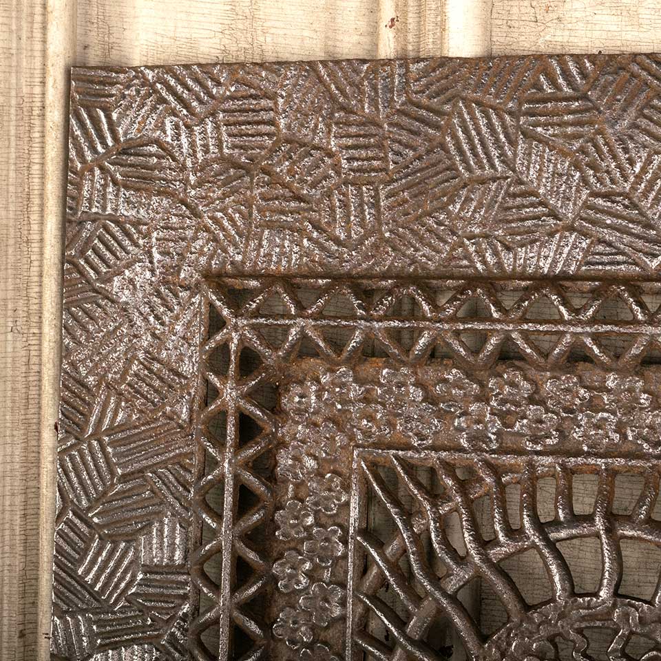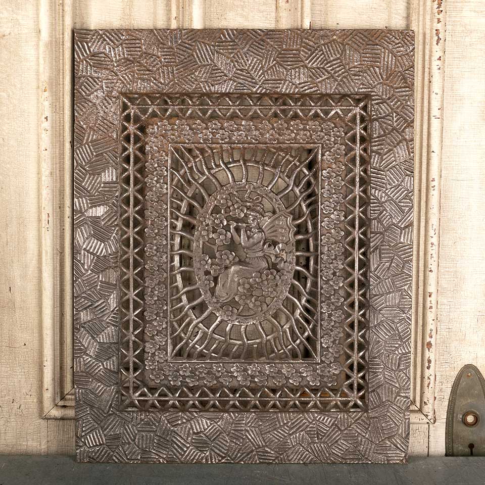 Architectural salvage antique cast iron fireplace summer front cover with figural and floral motif measuring approx. 19 15/16" wide x 25 1/2" tall x 3/4" front to back. See photos to evaluate condition.