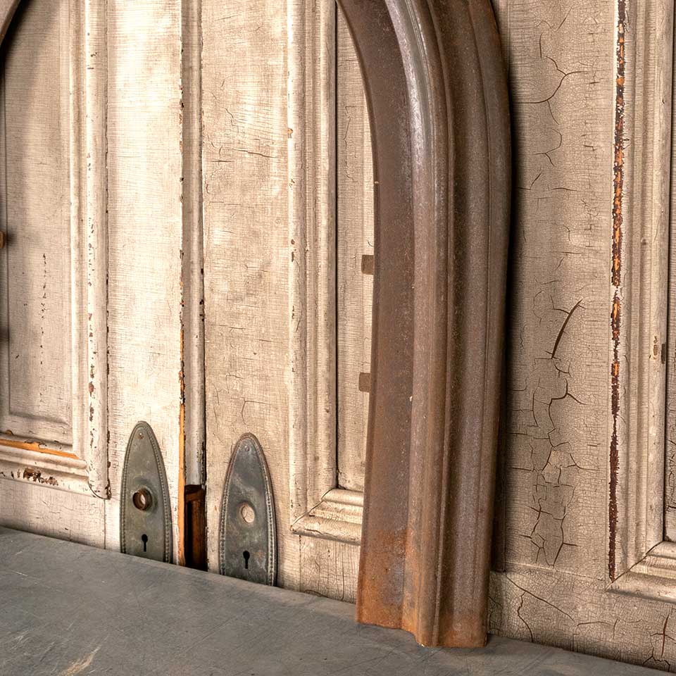 Architectural salvage antique arched top cast iron fireplace surround measuring approx. 32 7/16" wide (at base) x 32 3/4" tall x 1 3/4" front to back. The interior arched top firebox opening measures approx. 21 3/8" wide x 27 1/4" tall. See photos to evaluate condition.