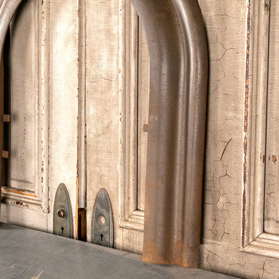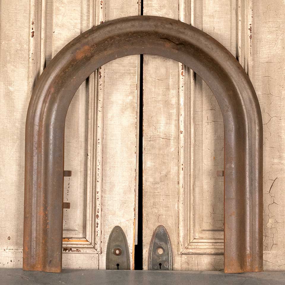 Architectural salvage antique arched top cast iron fireplace surround measuring approx. 30 5/8" wide (at base) x 33" tall x 1" front to back. The firebox opening measures approx. 20 1/4" wide x 27 5/8" tall. See photos to evaluate condition.