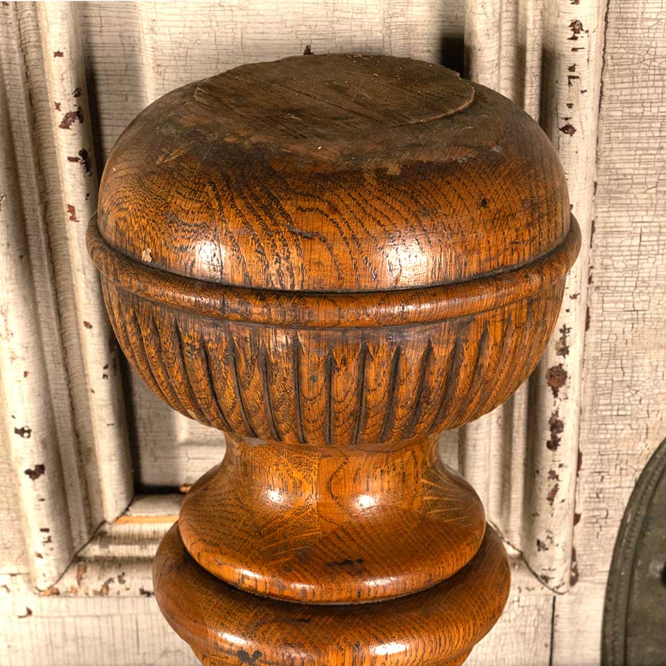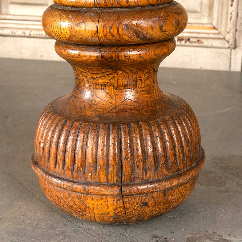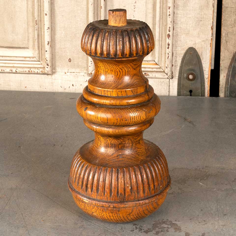 Architectural salvage antique oak turned furniture finial / foot measuring approx. 12 3/4" tall with a 3 1/2" diameter top and a 6 1/4" diameter base. Color and condition may vary, see photos to evaluate. Priced at $55/each.