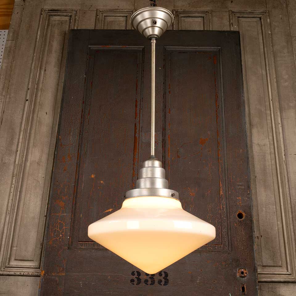 Architectural salvage antique Art Deco pendant light fixture with milk glass globe measuring approx. 14" in diameter x 32" tall (overall). There's a hole in the ceiling canopy where a pull chain switch was once located. See photos to evaluate condition. Salvaged lighting should be inspected by a licensed electrician prior to installation.