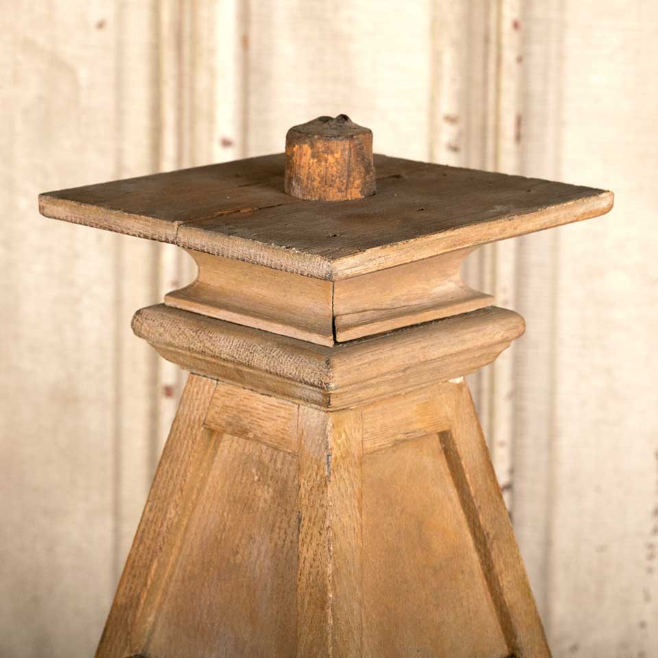 Architectural salvage antique oak finial measuring approx. 9 3/4" tall (not including dowel on top) with a 4 3/8" square base, a 5" square middle, and a 4 1/2" square top. See photos to evaluate condition.