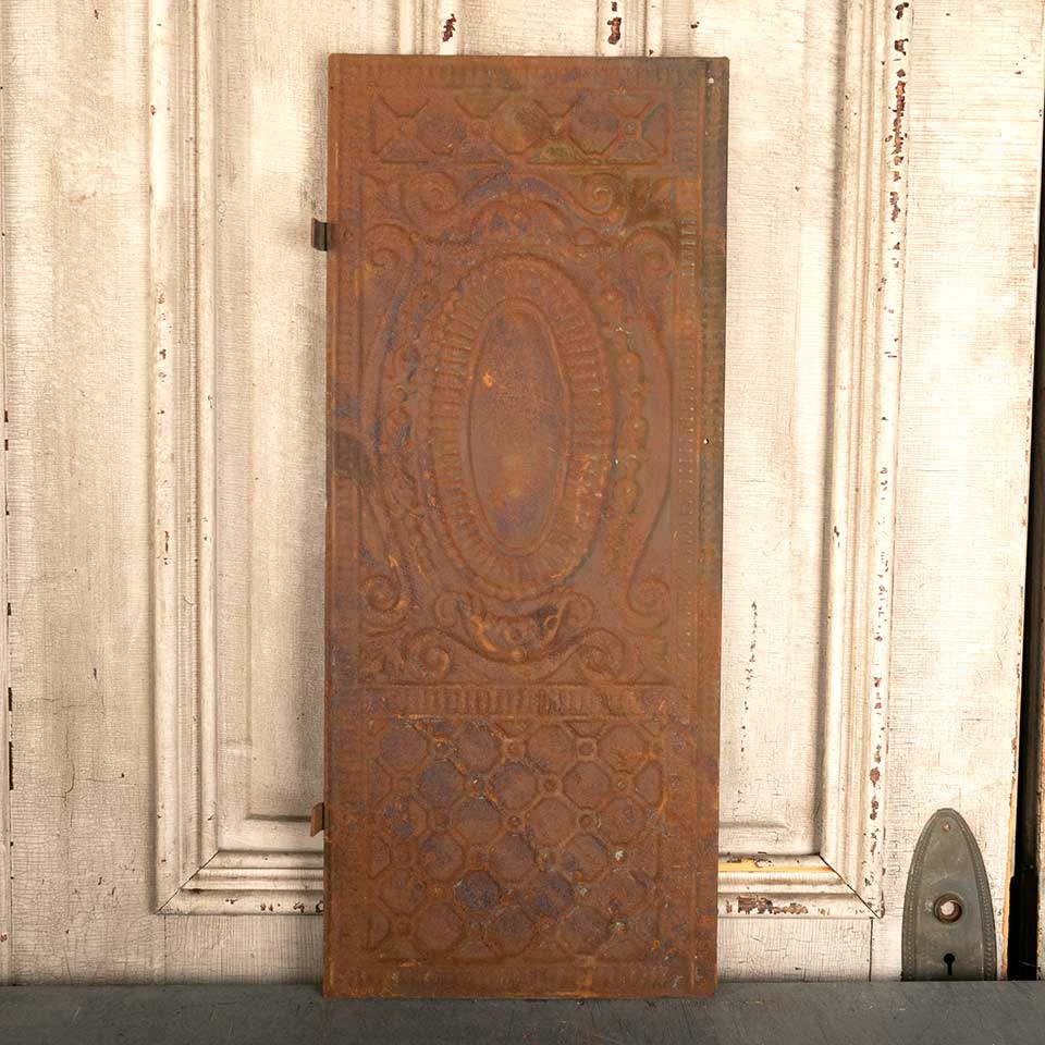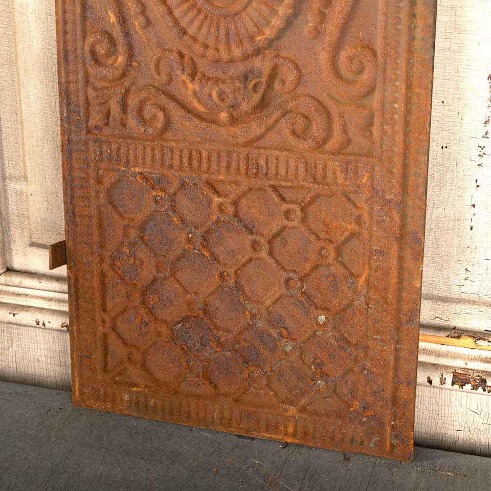 Architectural salvage antique rusty stamped metal fireplace fireback panel measuring approx. 12 1/2" wide (not including tabs) x 29 1/2" tall x 1/8" thick. See photos to evaluate condition.