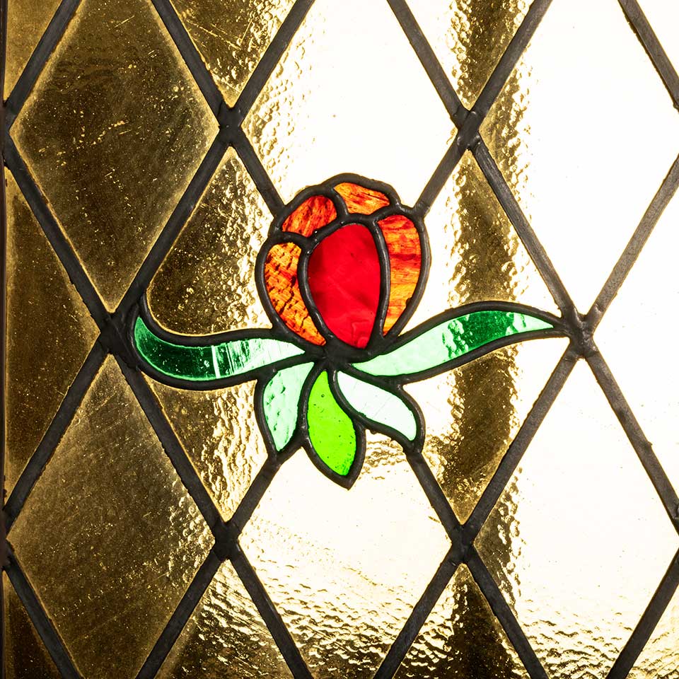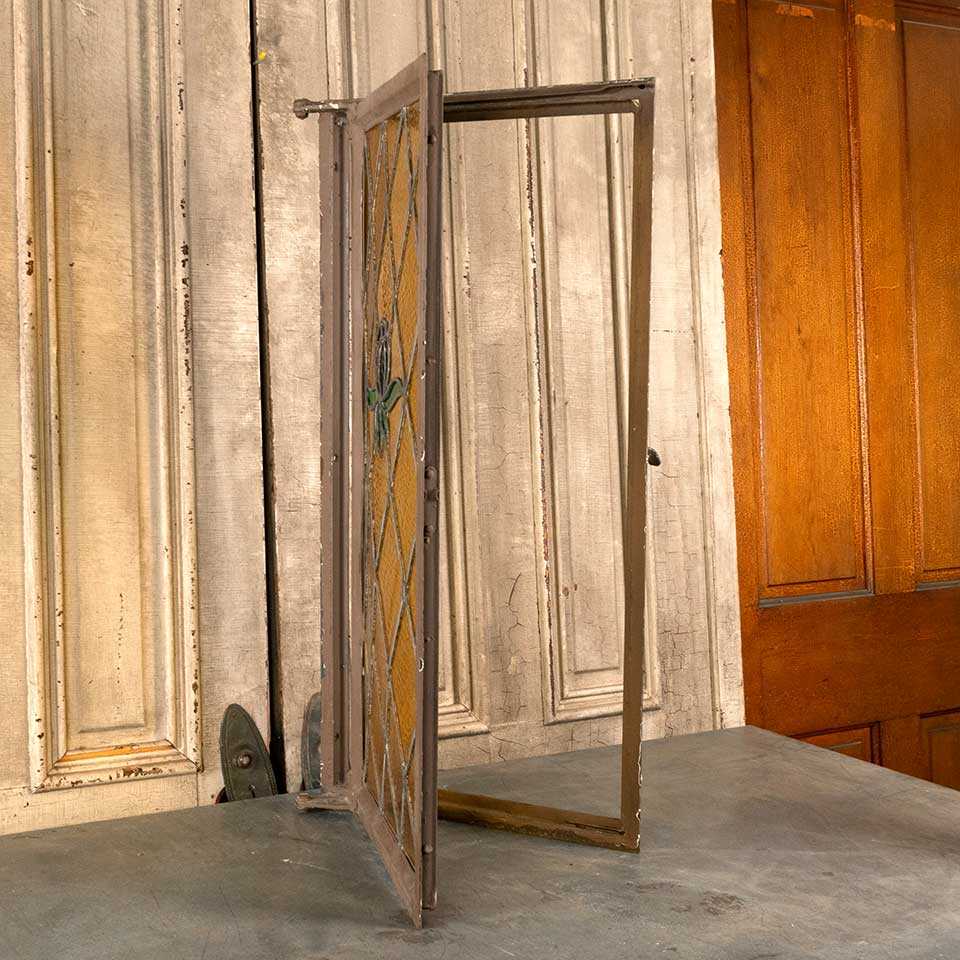 Architectural salvage antique leaded stained glass metal casement window with floral motif measuring approx. 19 3/8" wide x 39 3/8" tall x 2" front to back. The glass is slightly bowed. See photos to evaluate condition.