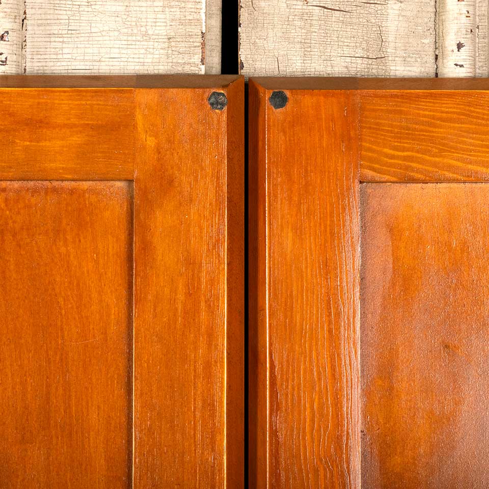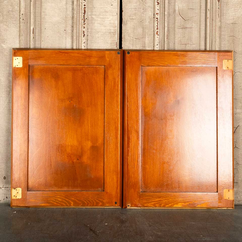 Pair of architectural salvage 16" cabinet doors together measuring approx. 32" wide x 23" tall x 1" thick. Color and condition may vary, see photos to evaluate. Priced at $45/pair.