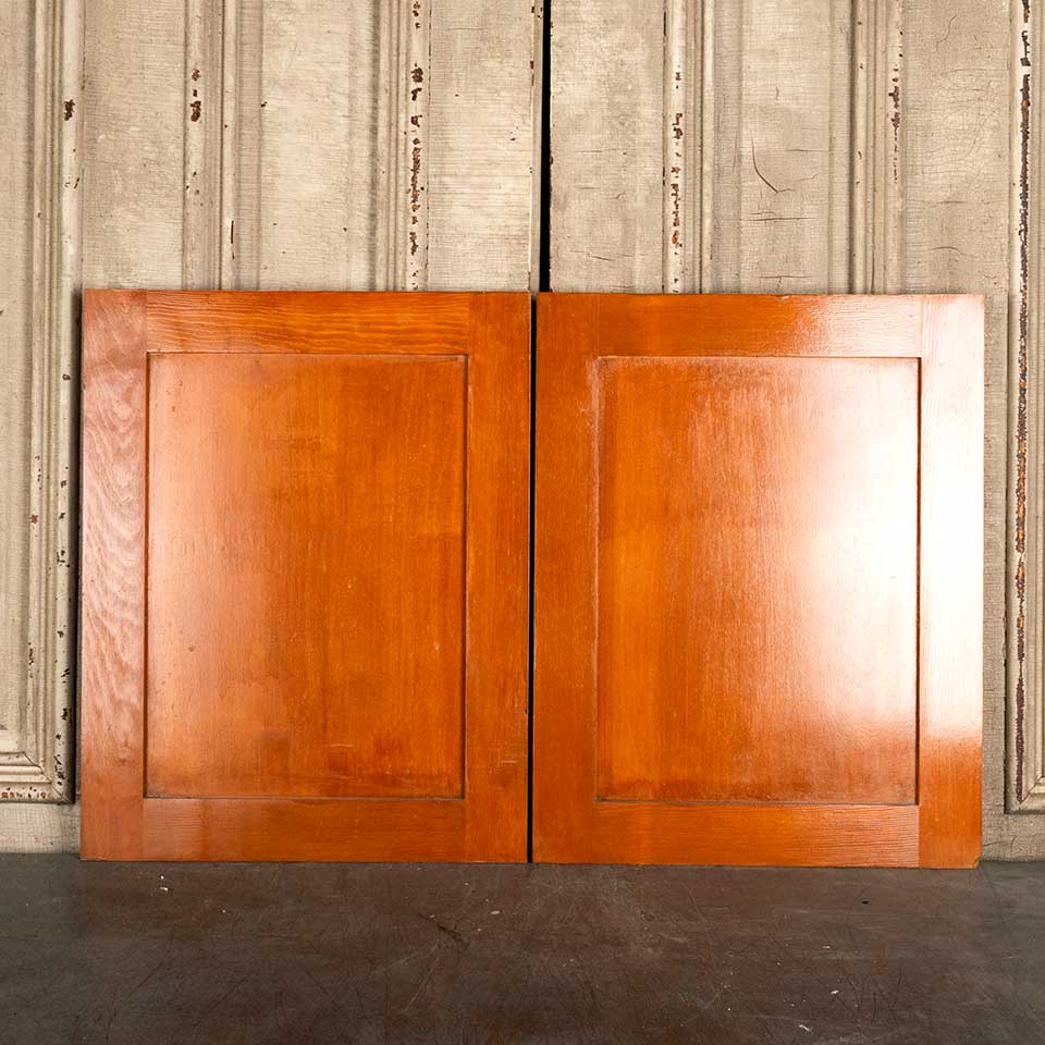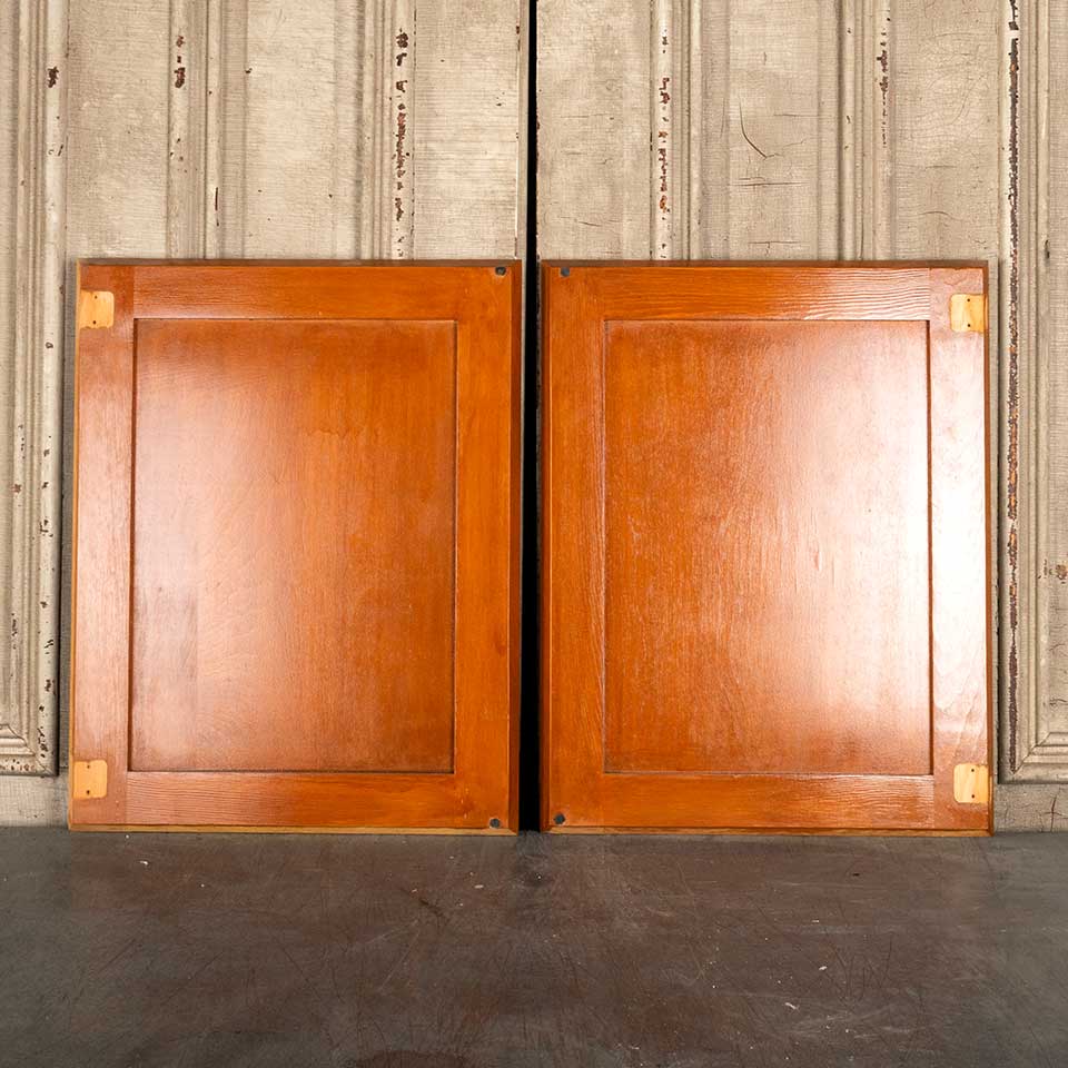 Pair of architectural salvage 18" cabinet doors together measuring approx. 36" wide x 23" tall x 1" thick. Color and condition may vary, see photos to evaluate. Priced at $50/pair.