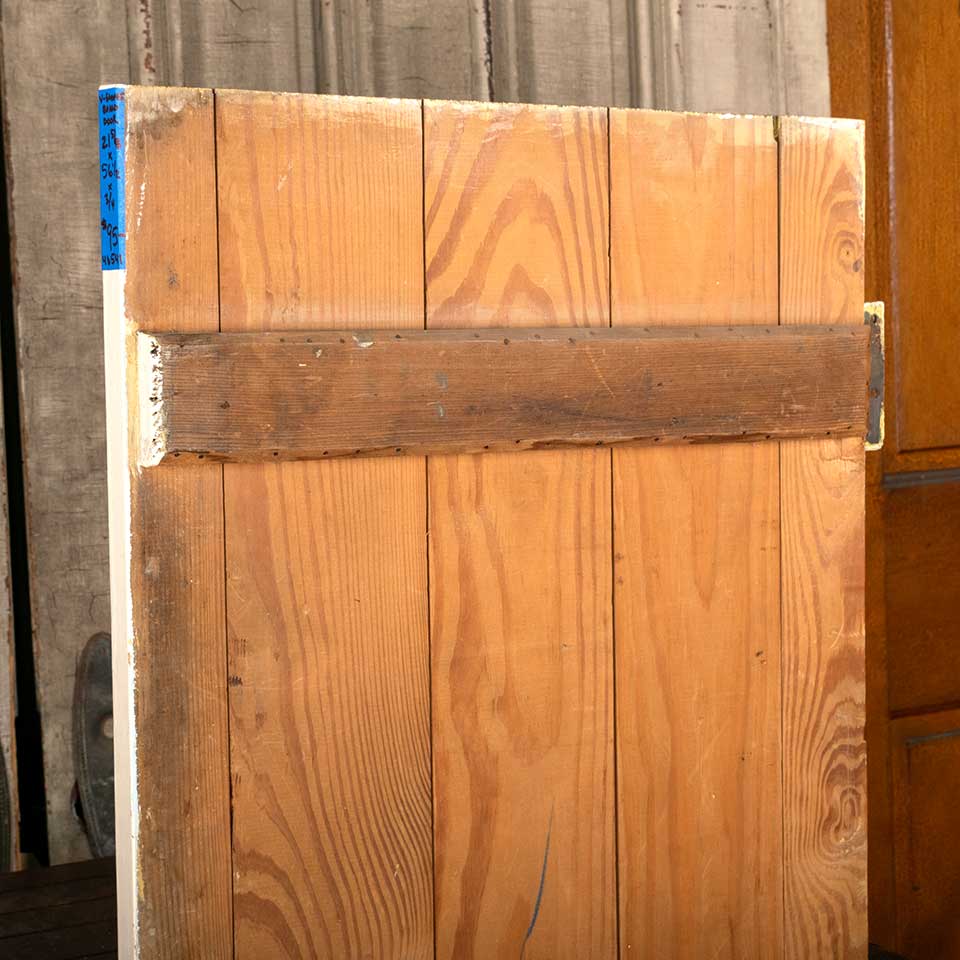 Architectural salvage antique V-groove board door measuring approx. 21 5/8" wide x 56 1/2" tall x 1 1/2" front to back. See photos to evaluate condition.