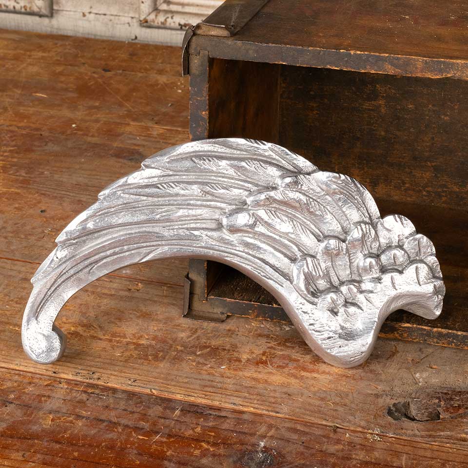 Architectural salvage antique cast aluminum wing ornament measuring approx. 10 3/4" long x 6" tall x 7/8" front to back. Color and condition may vary, see photos to evaluate. Priced at $39/each.