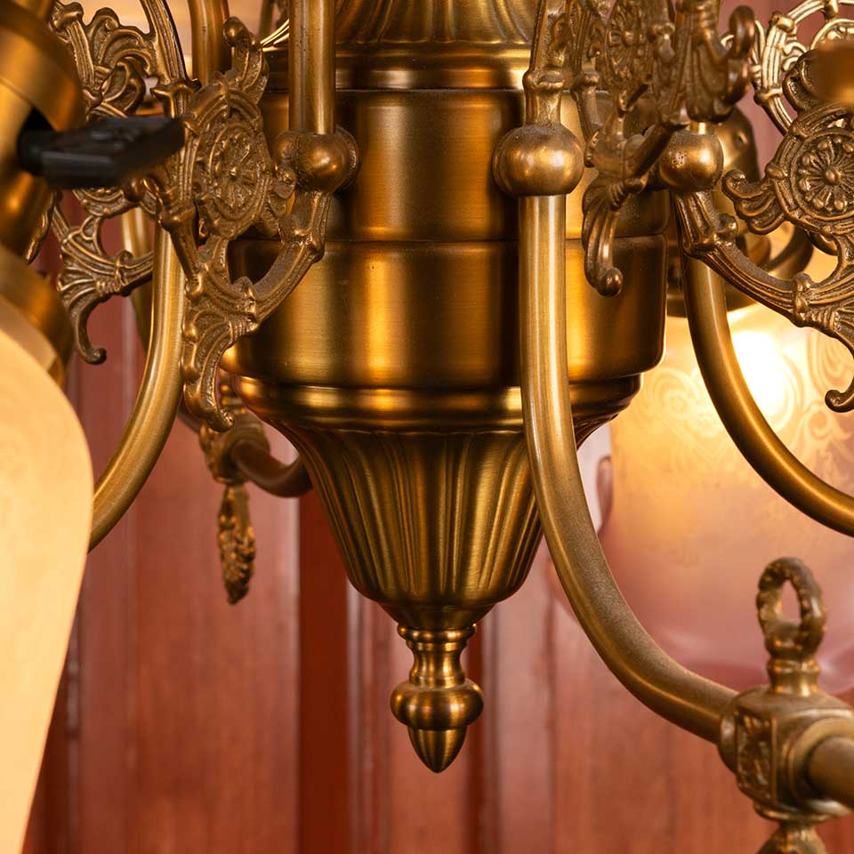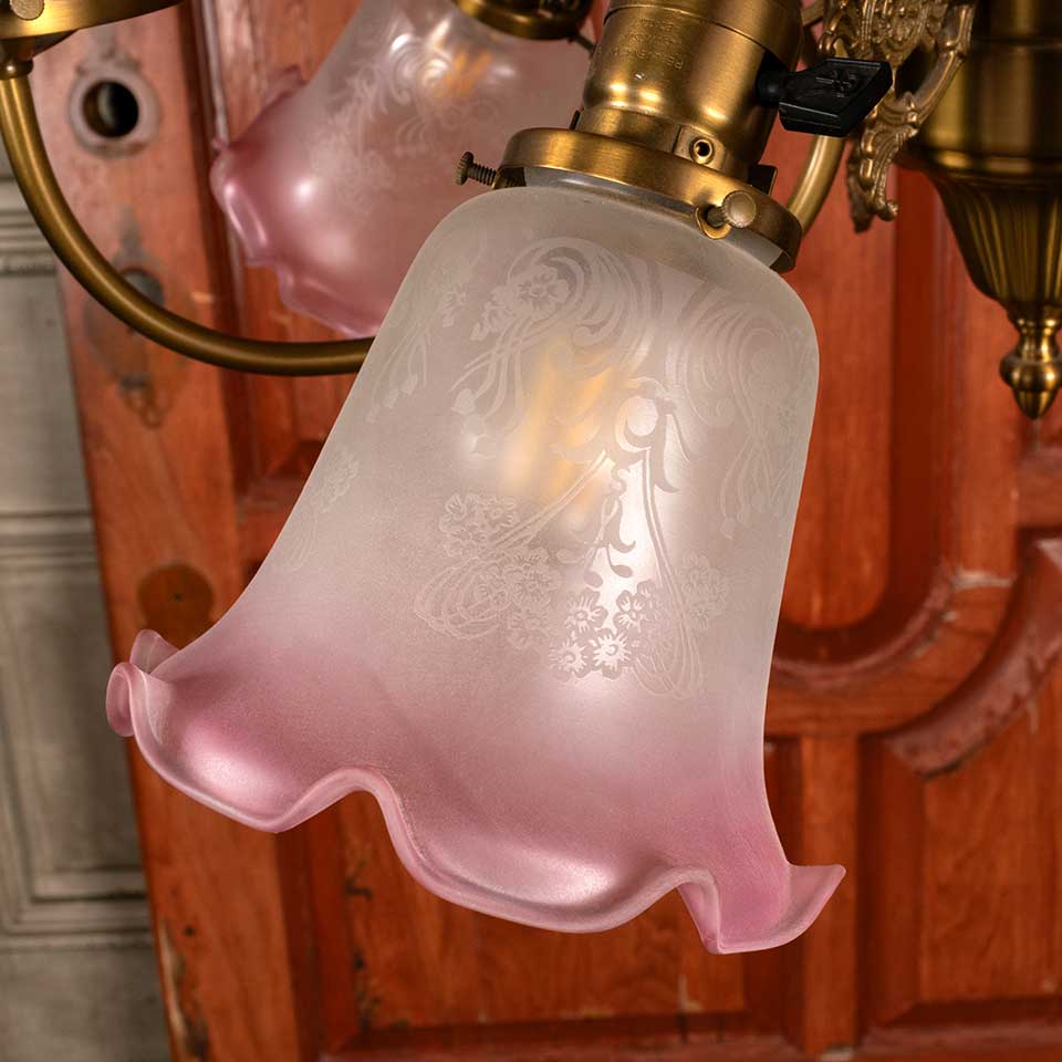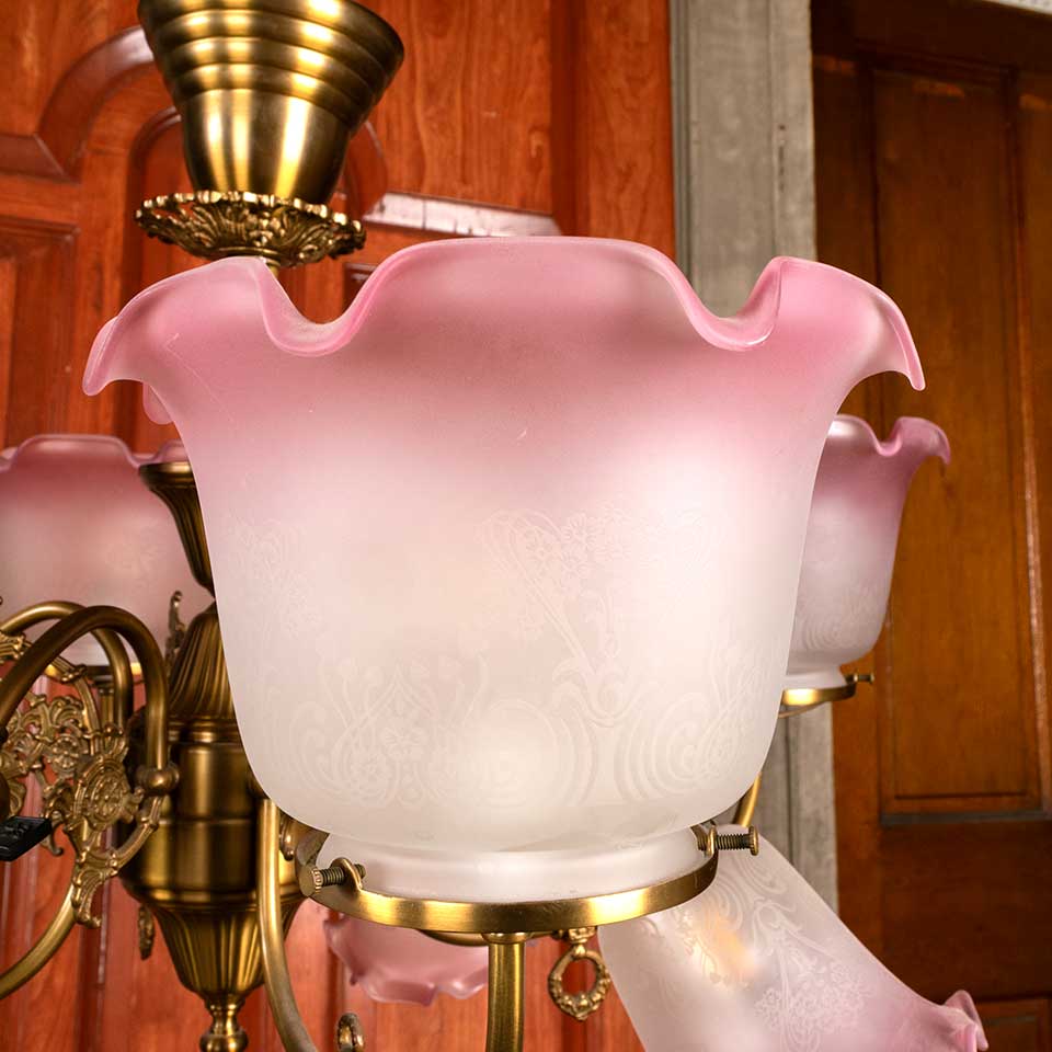 Architectural salvage reproduction antique Victorian eight light chandelier with etched glass shades measuring approx. 30 1/2" in diameter x 22" tall. This fixture includes an 83 1/2" long brass riser if a taller fixture is required. Salvaged light fixtures should be inspected by a licensed electrician prior to installation. See photos to evaluate condition.