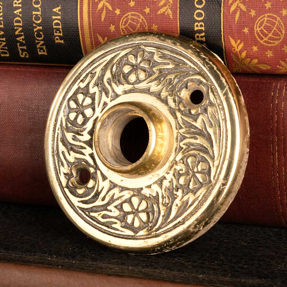 Architectural salvage reproduction large ornate brass doorknob rosette door hardware measuring approx. 2 1/2" in diameter with a 3/4" diameter collar. Color and condition vary, see photos to evaluate condition. Priced at $20/each.