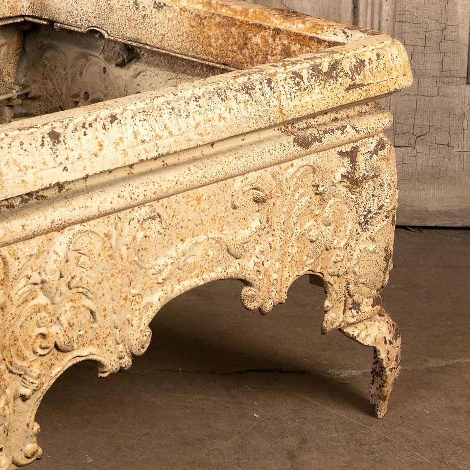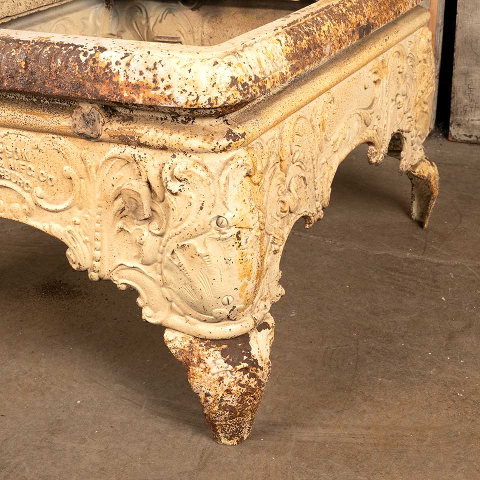 Architectural salvage antique ornate cast iron stove base measuring approx. 24" wide x 17" tall x 27" front to back. This piece is marked SIMPSON STOVE & MFG CO. PITTSBURG. See photos to evaluate condition.