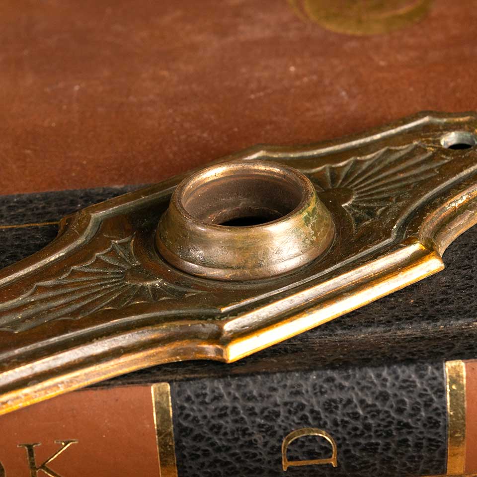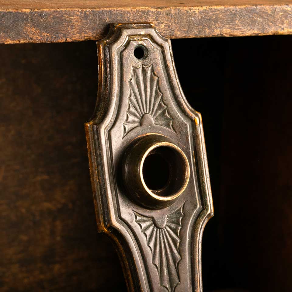 Architectural salvage antique brass Russell & Erwin Juno pattern (c. 1930) doorknob backplate door hardware measuring approx. 2" wide x 6 1/2" tall with a 7/8" diameter collar. The spindle and keyhole measure 2 1/2" on centers. See photos to evaluate condition.