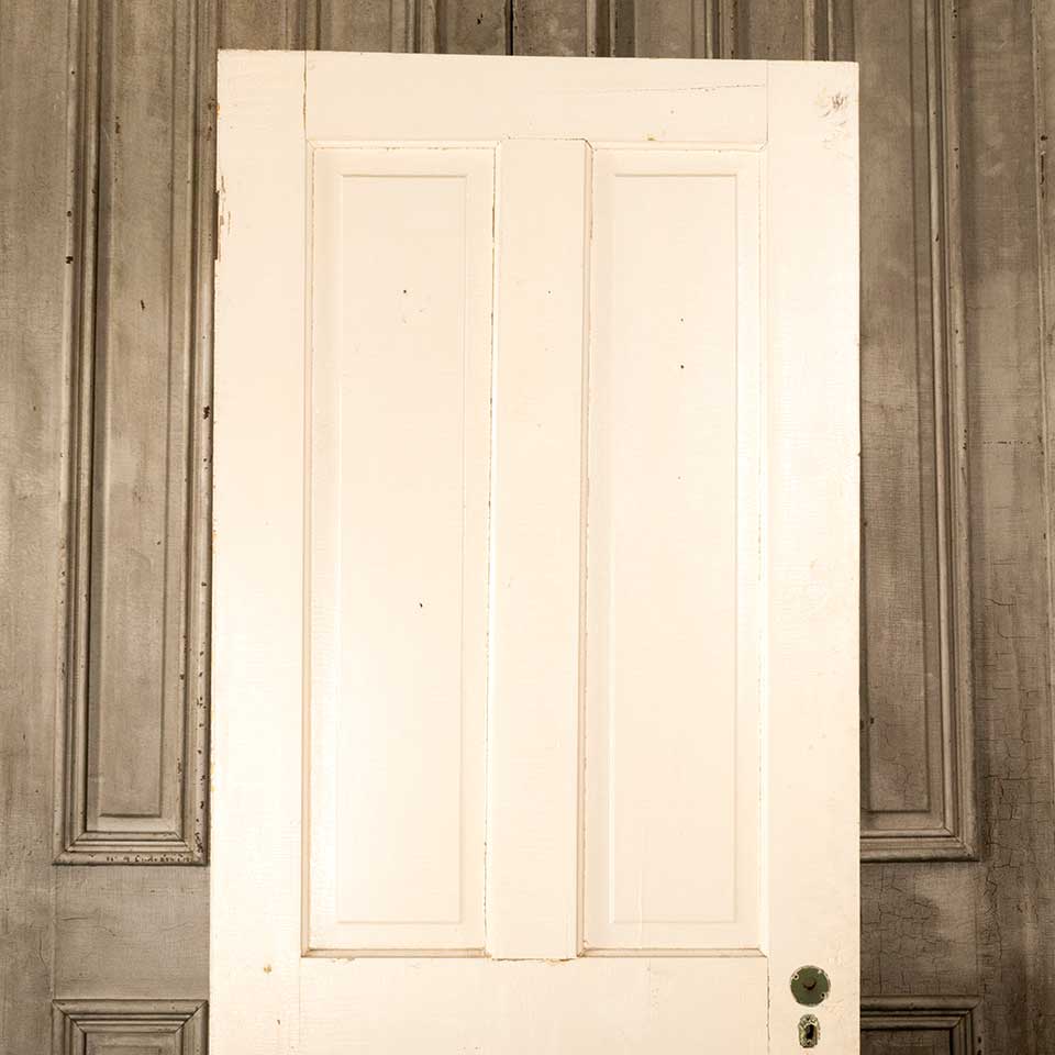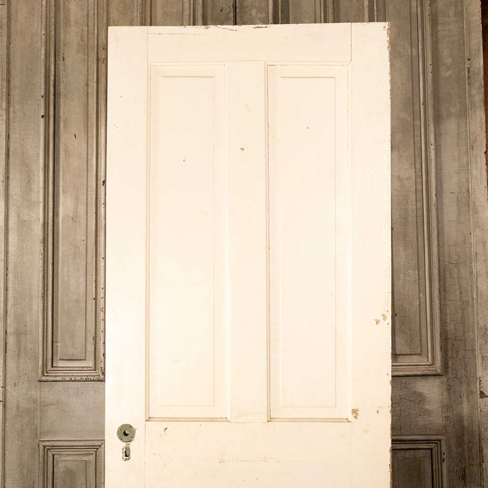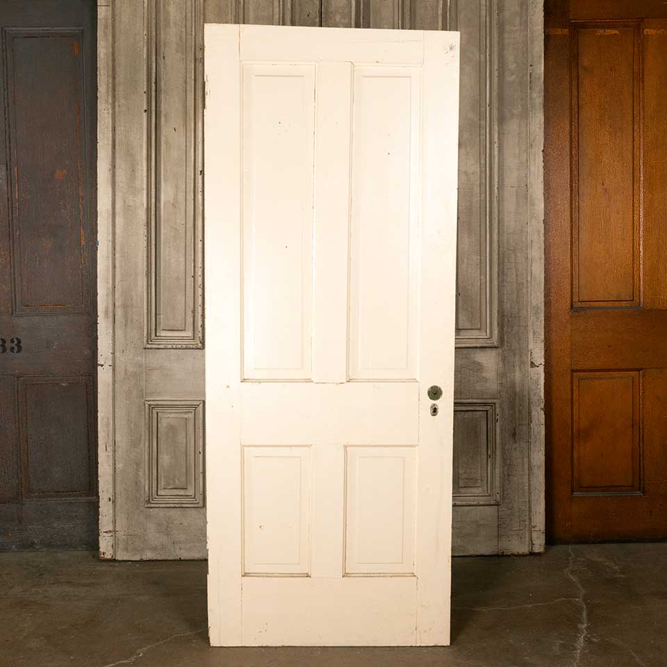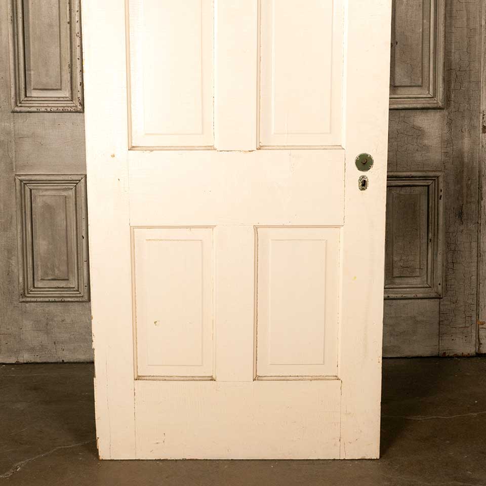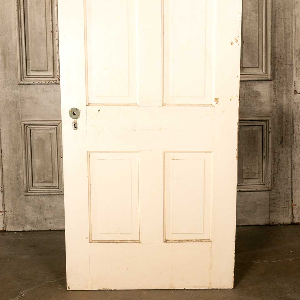 Architectural salvage antique four panel painted wood interior door measuring approx. 32" wide x 79 3/4" tall x 1 3/8" thick. There appears to be a split in the top rail. See photos to evaluate condition.