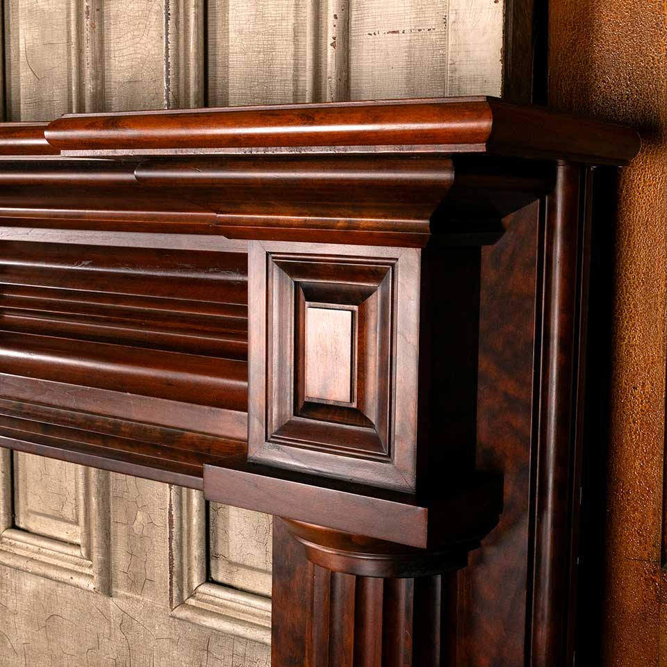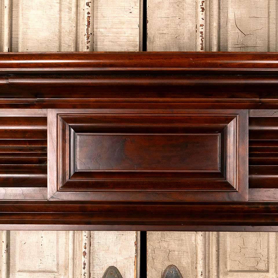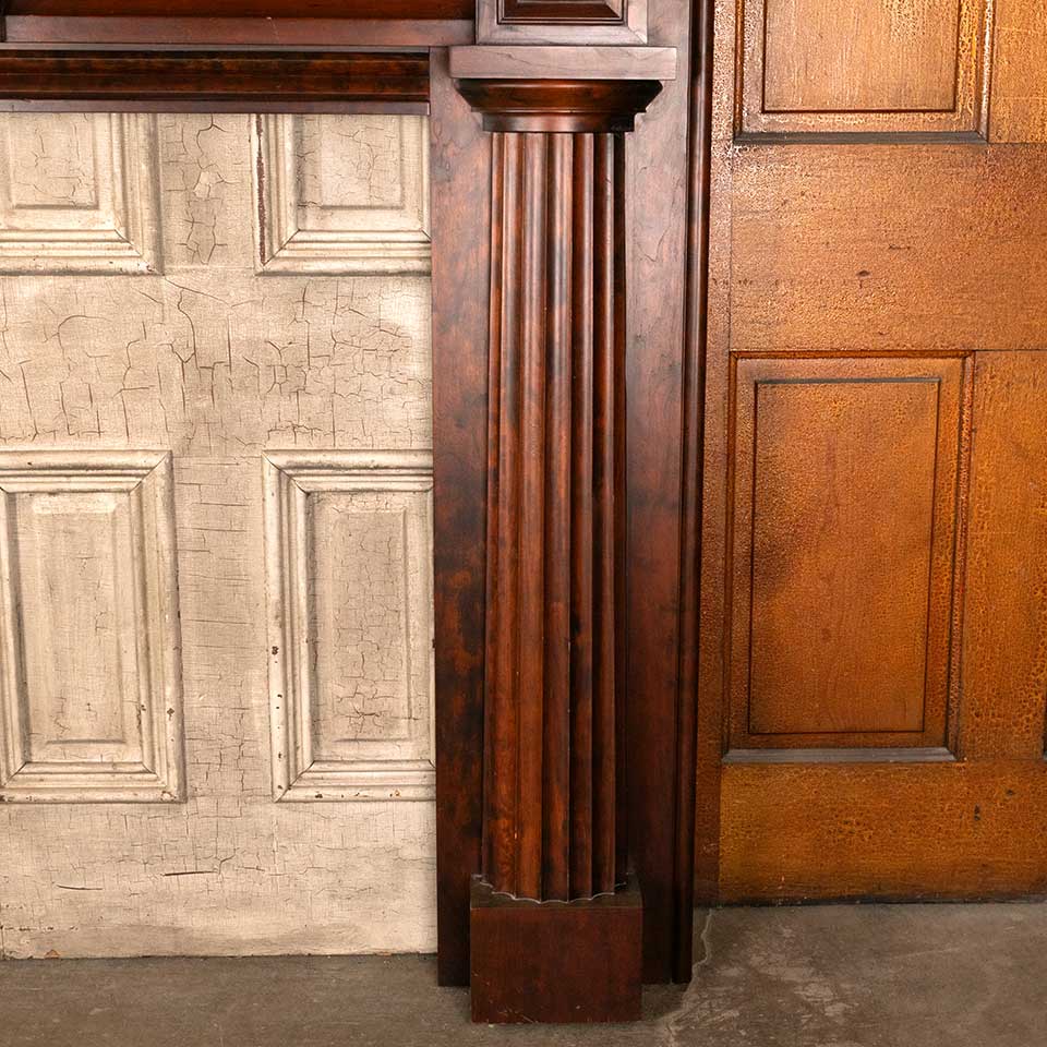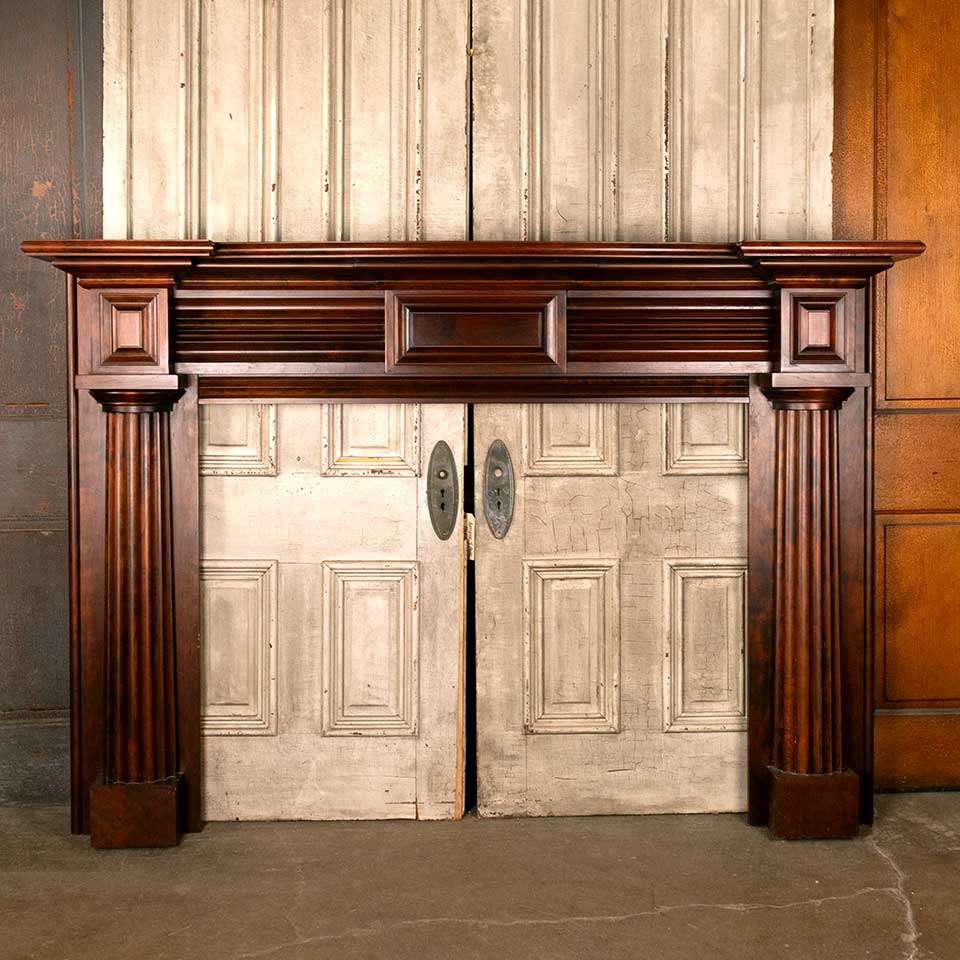 Architectural salvage wood (walnut?) fireplace mantel / mantle with fluted engaged columns measuring approx. 82 3/4" wide x 57 1/4" tall x 10 1/2" front to back. The interior firebox opening measures approx. 54" wide x 42" tall. This is not an antique mantel. See photos to evaluate condition.