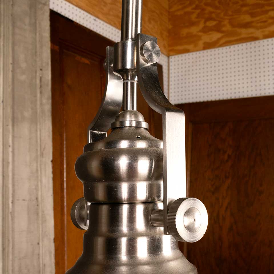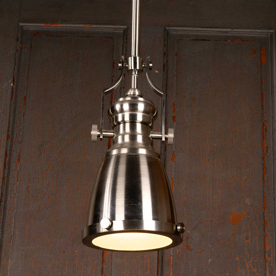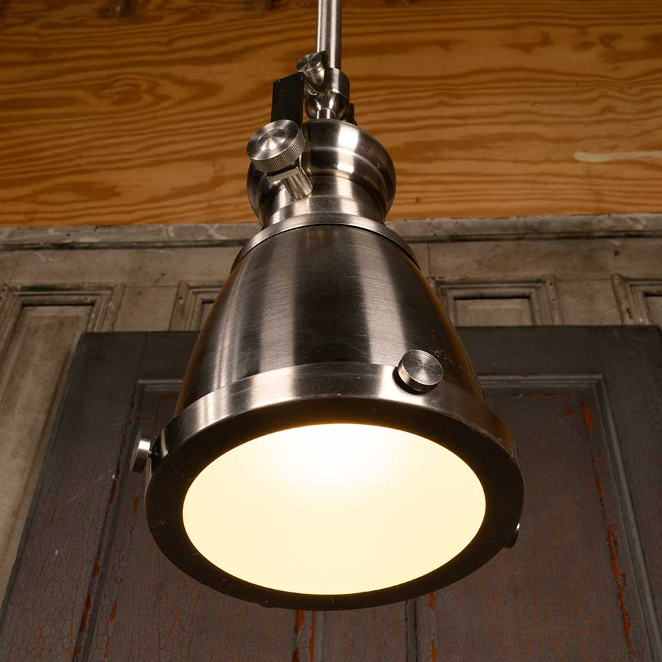 Architectural salvage modern industrial style pendant light fixture measuring approx. 7 3/4" in diameter x 28 1/4" tall. See photos to evaluate condition. Salvaged lighting should be inspected by a licensed electrician prior to installation.