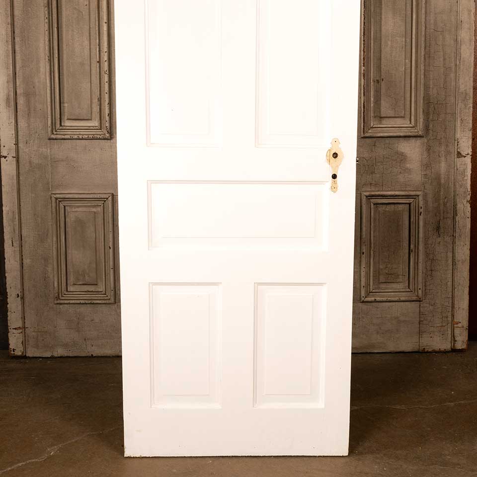 Architectural salvage antique five panel painted wood interior door with mortise lock measuring approx. 28 1/4" wide x 75 1/8" tall x 1 3/8" thick. There's some wood loss at the top corner of the hinged side of the door on one side. See photos to evaluate condition.