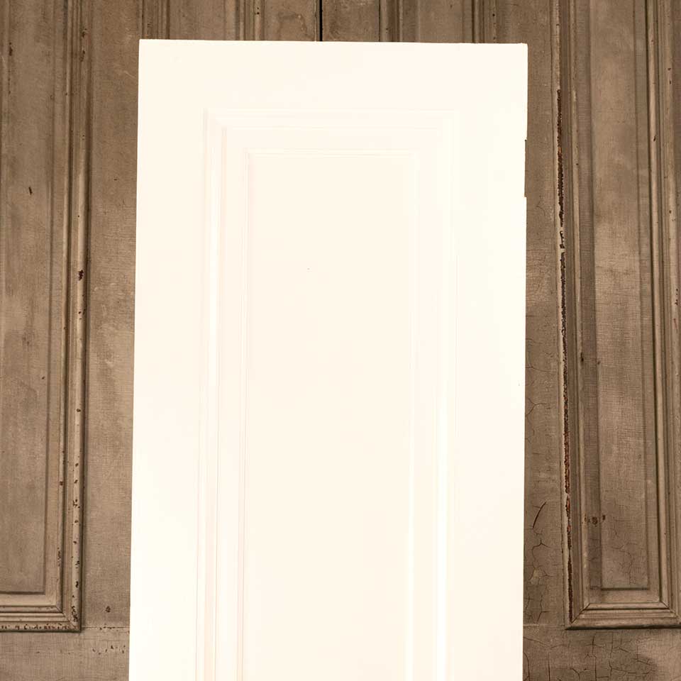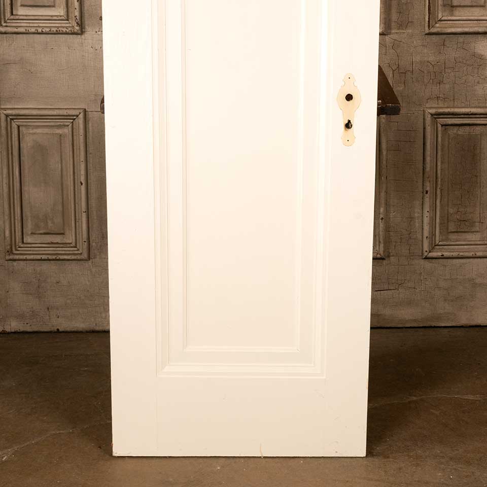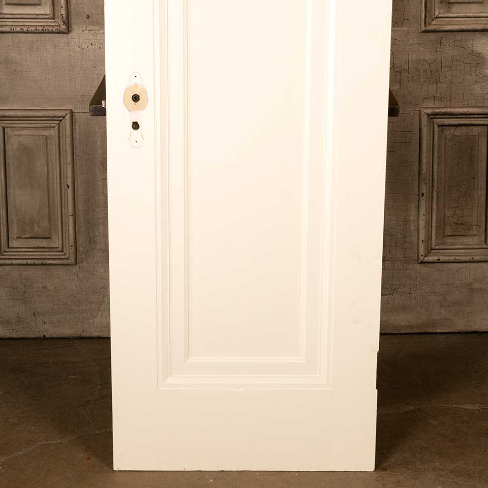 Architectural salvage antique painted wood one panel interior Miracle door with mortise lock measuring approx. 23 7/8" wide x 76 7/16" tall x 1 3/8" thick. See photos to evaluate condition.