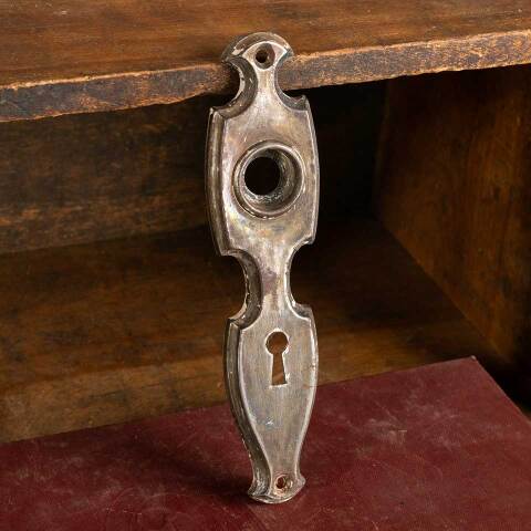 Architectural salvage antique stamped / pressed steel doorknob backplate door hardware with keyhole measuring approx. 1 1/2" wide x 6 1/4" tall with a 7/8" diameter collar. Spindle and keyholes measure 2 1/2" on center. Color and condition may vary, see photos to evaluate. Priced at $15/each.