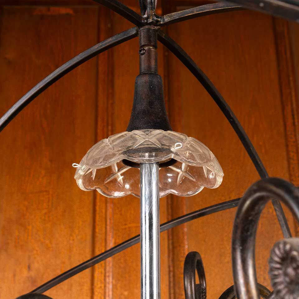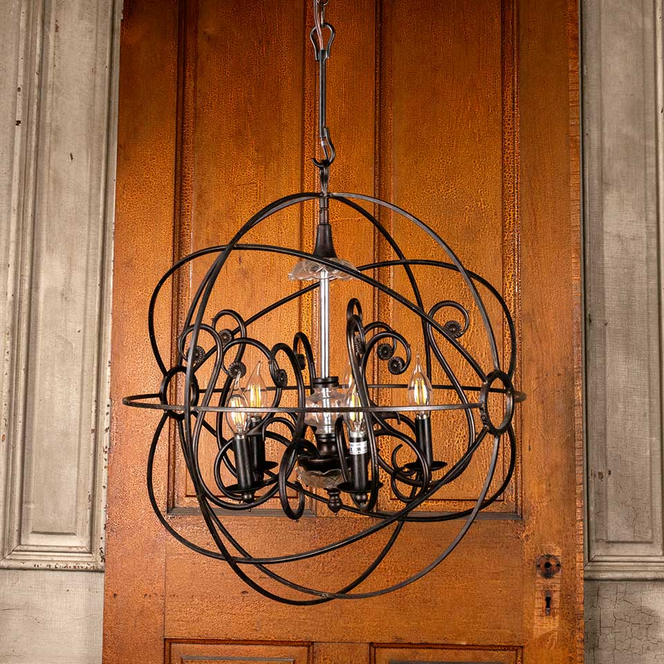 Architectural salvage modern metal sphere five light chandelier measuring approx. 22" in diameter with a 121" long chain. See photos to evaluate condition. Salvaged lighting should be inspected by a licensed electrician prior to installation.
