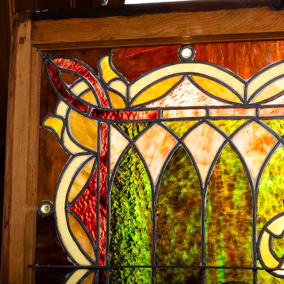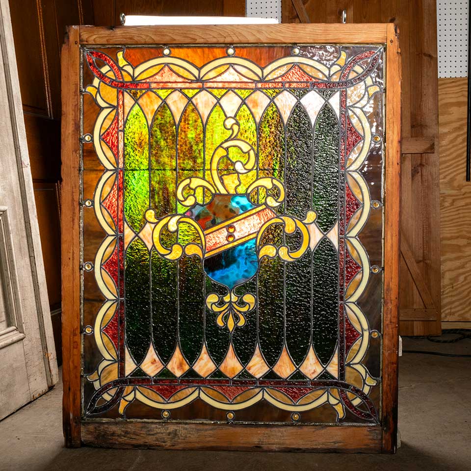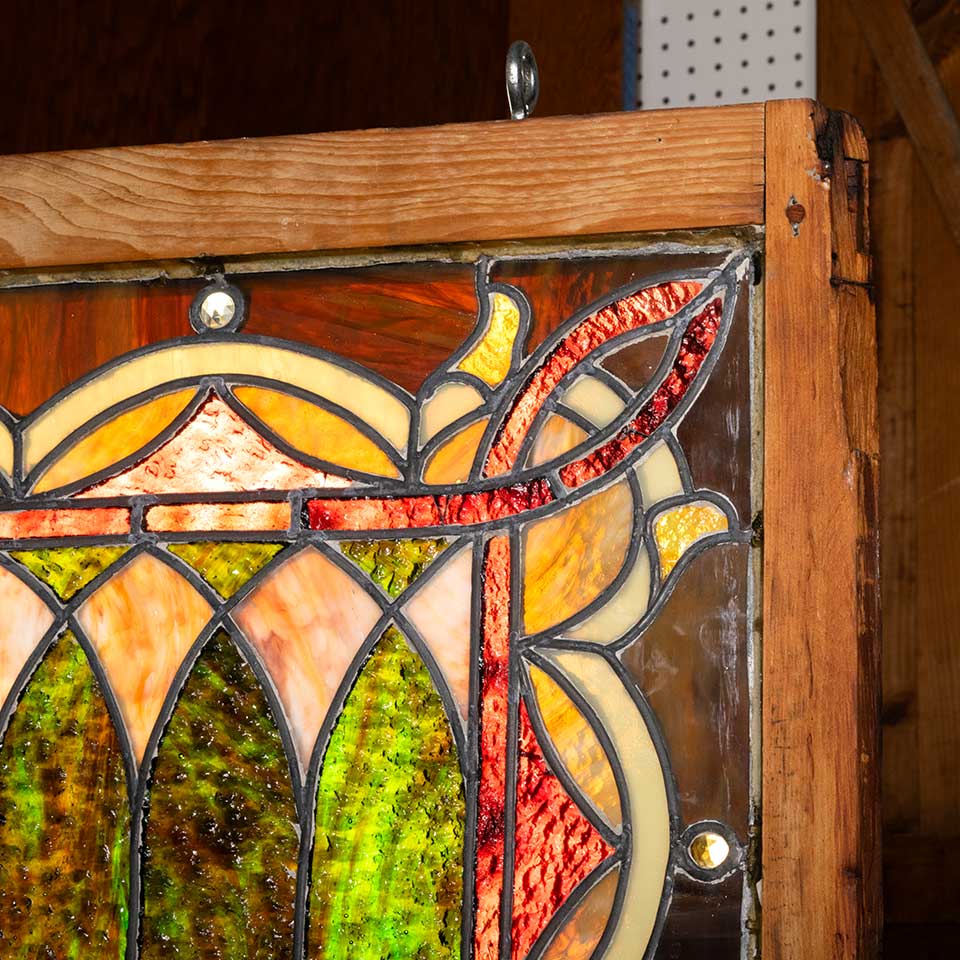 Architectural salvage antique stained glass window panel in wood frame measuring approx. 35 1/2" wide x 44 7/8" tall x 1 11/16" thick. There's some minor cracking in the glass, but all intact. See photos to evaluate condition.