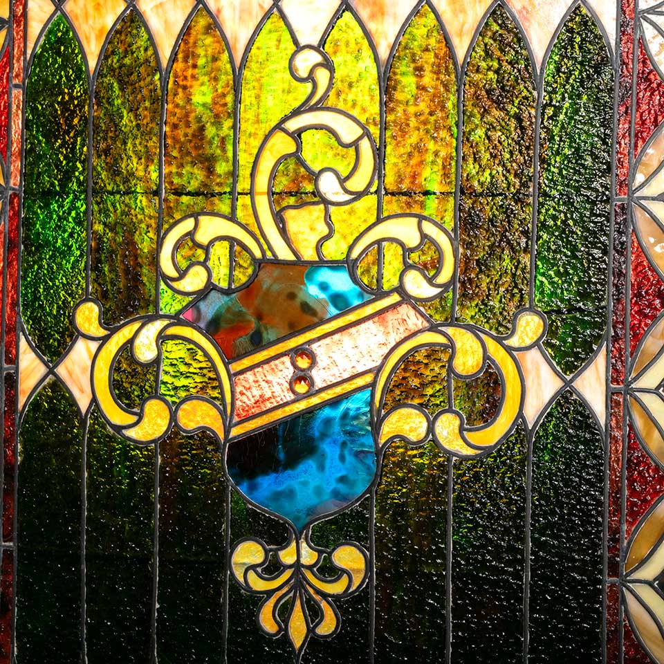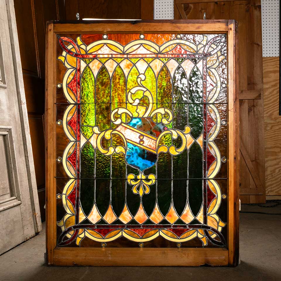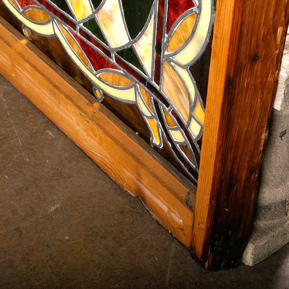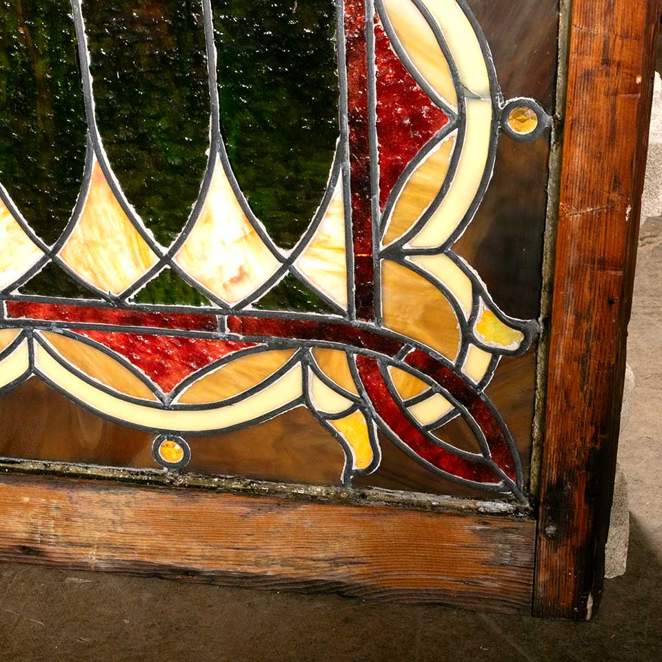 Architectural salvage antique stained glass window panel in wood frame measuring approx. 35 1/2" wide x 44 7/8" tall x 1 11/16" thick. There's some minor cracking in the glass, but all intact. See photos to evaluate condition.