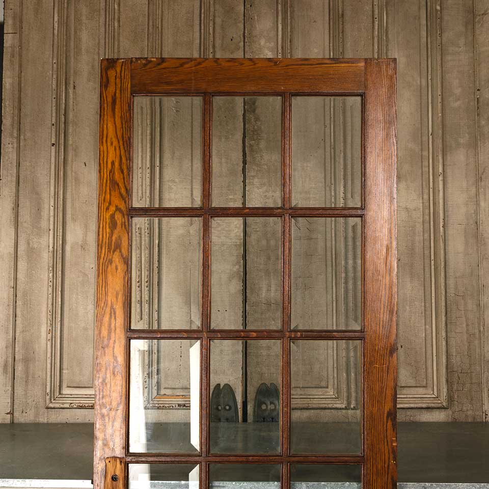Architectural salvage antique oak fifteen lite interior French door with mortise lock and beveled glass panels measuring approx. 32 5/8" wide x 79" tall x 1 3/4" thick. See photos to evaluate condition.