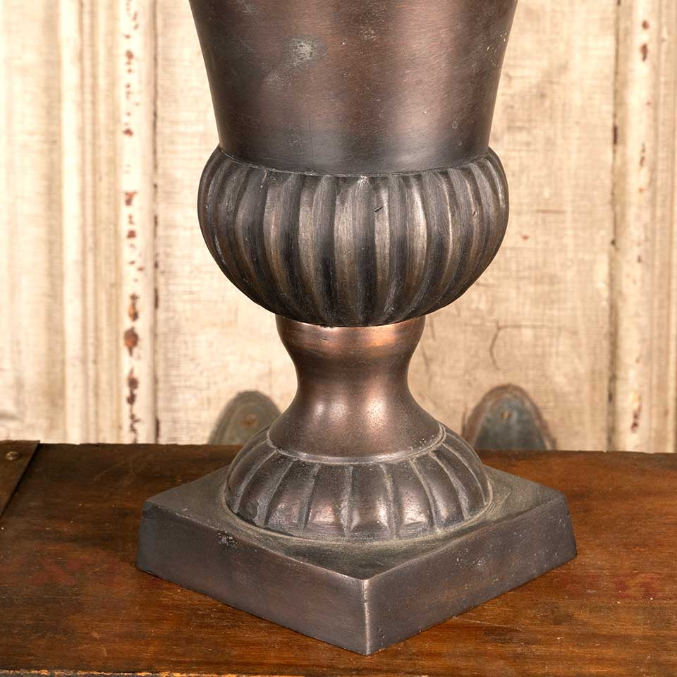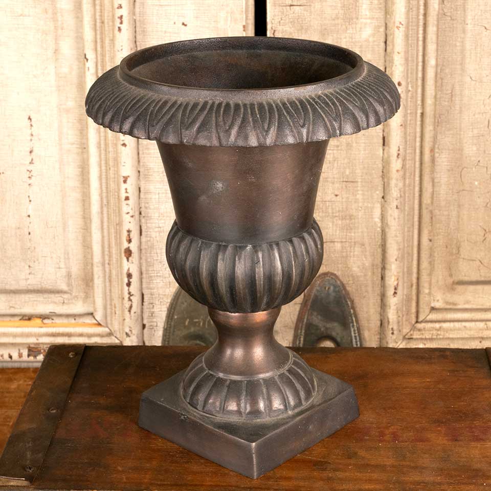 Architectural salvage small cast aluminum planter urn measuring approx. 7 1/2" in diameter x 9 3/4" tall with a 4" square base. See photos to evaluate condition.