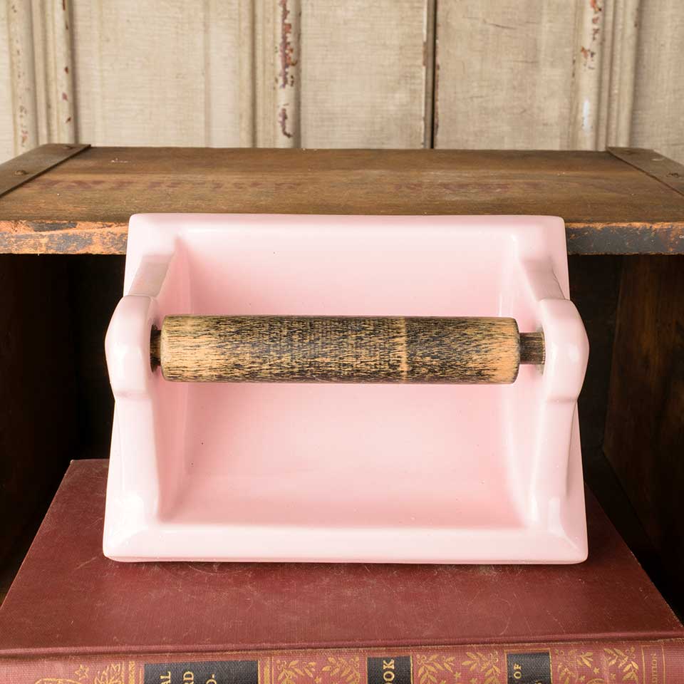 Architectural salvage vintage pink ceramic bathroom in-wall toilet paper holder measuring approx. 6 1/2" wide x 5" tall x 3 1/4" front to back. See photos to evaluate condition.