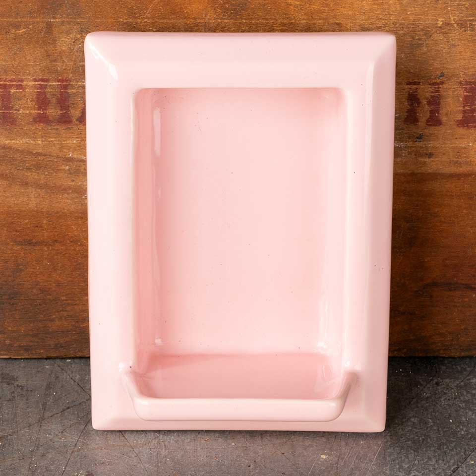 Architectural salvage vintage pink in-the-wall bathroom soap dish niche measuring approx. 4 3/4" wide x 6 1/2 tall x 3" front to back. See photos to evaluate condition.