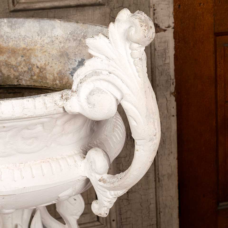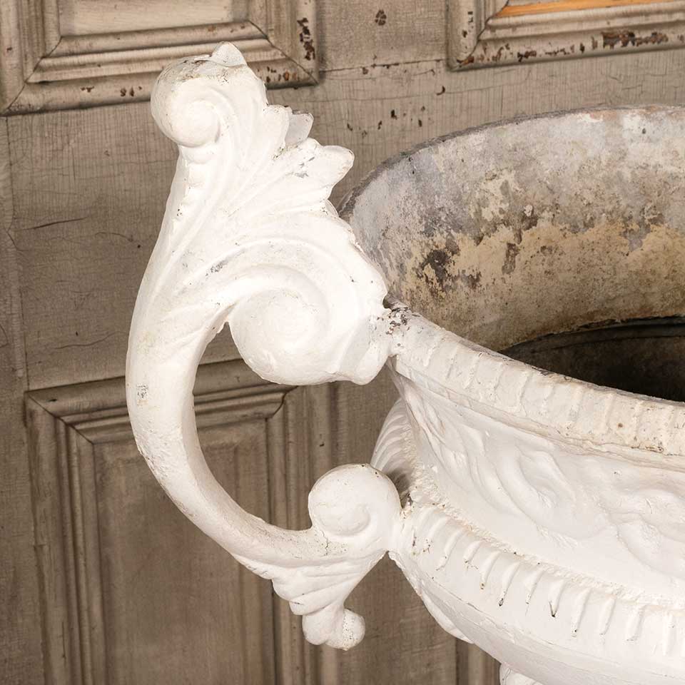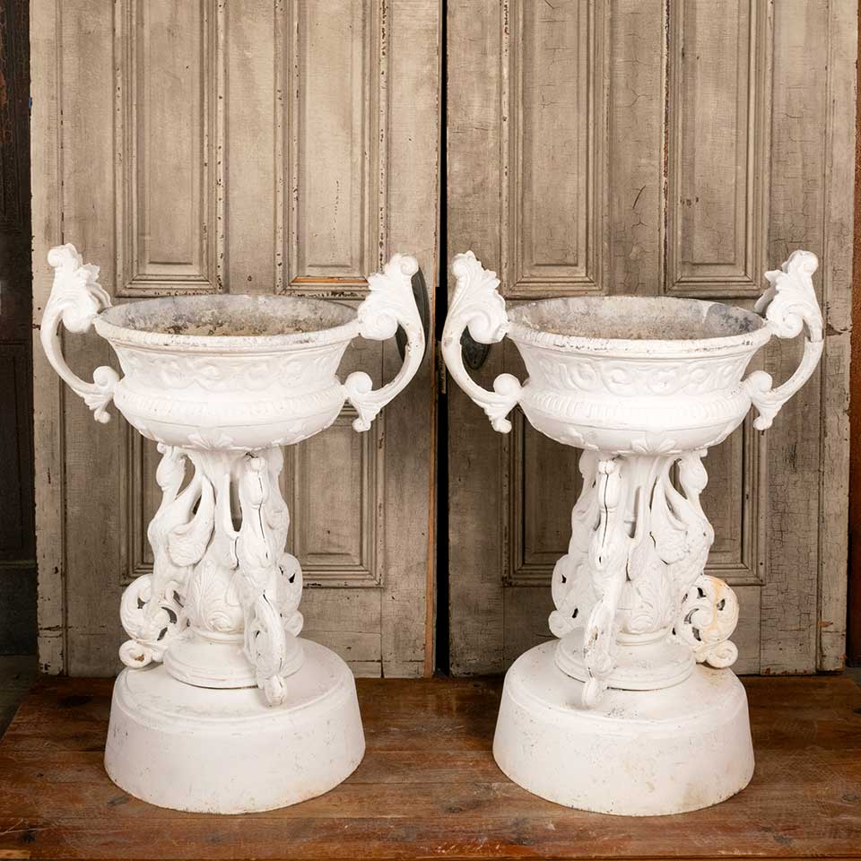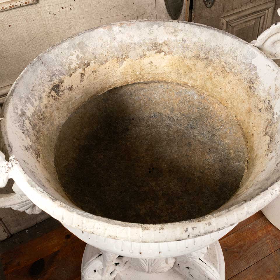 Pair of architectural salvage cast aluminum handled garden planter urns with swans each measuring approx. 29 1/2" wide x 40" tall (overall) with a 20" diameter bowl and a 20 1/2" diameter base. See photos to evaluate condition. Priced at $5,500 for the pair.