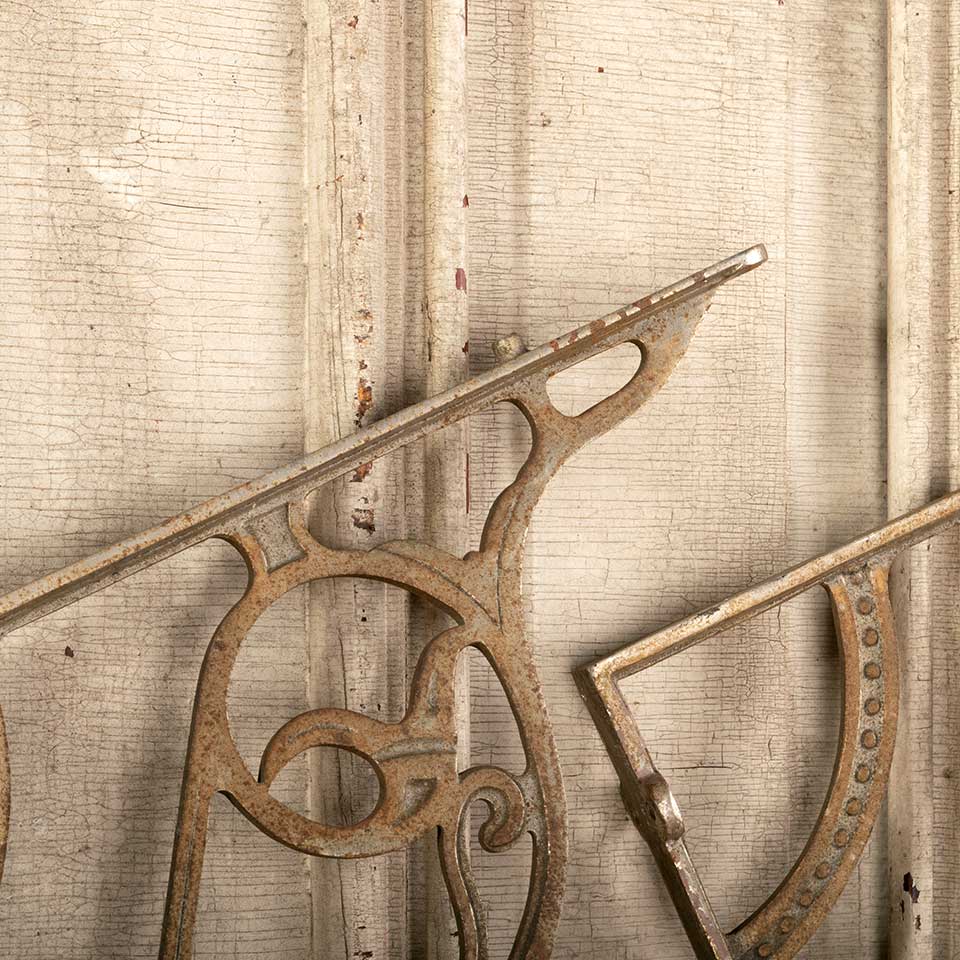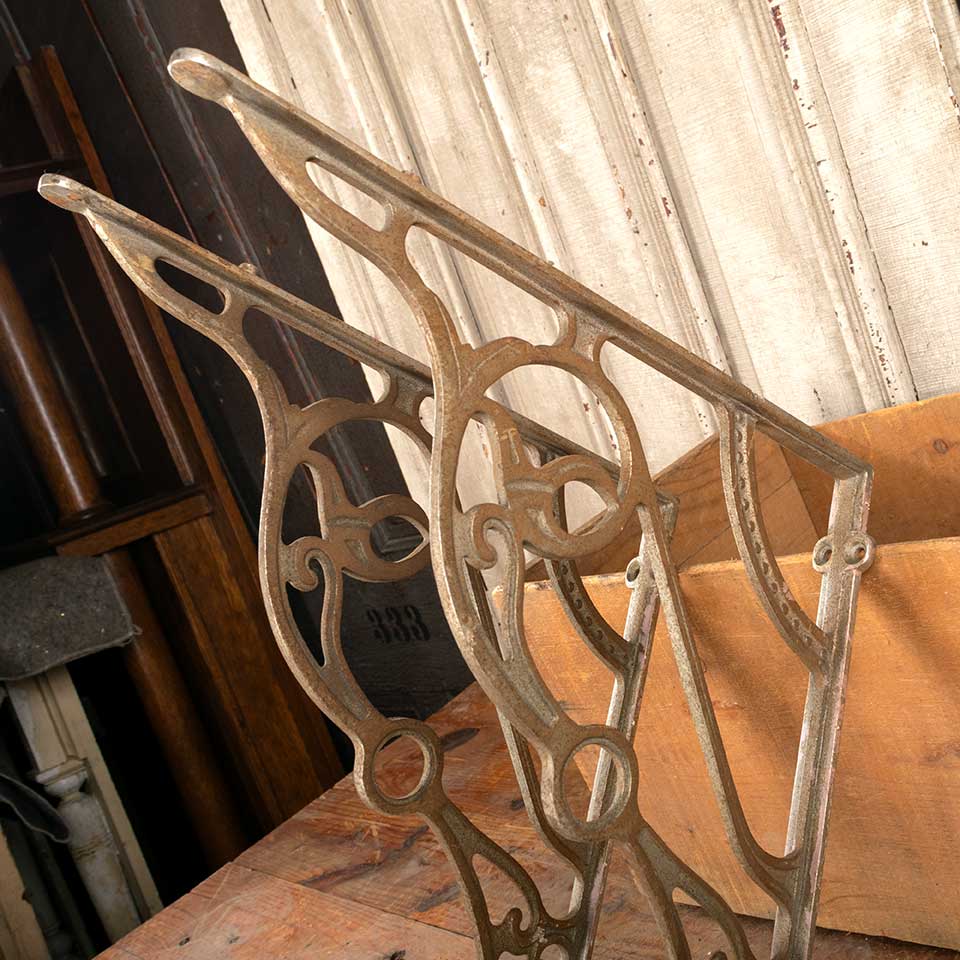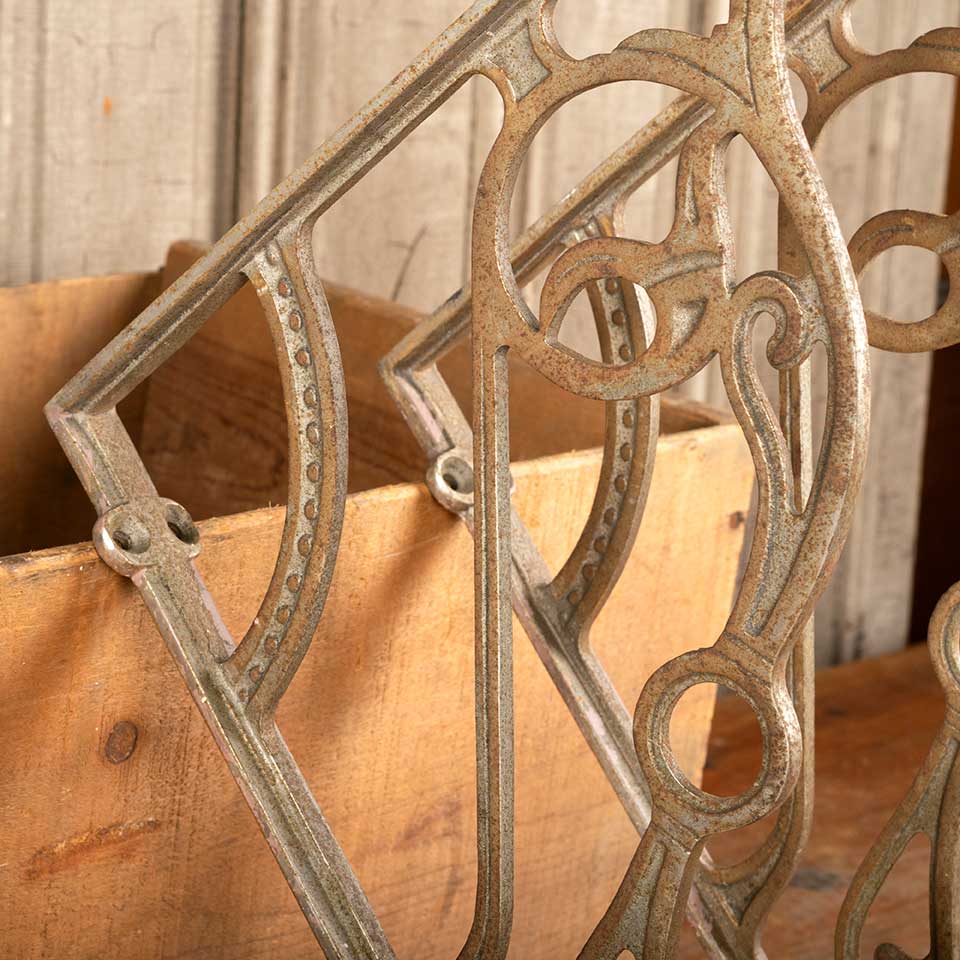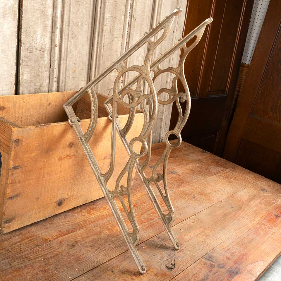 Pair of architectural salvage antique Victorian cast iron bathroom marble top sink brackets each measuring approx. 1 1/2" wide (widest point) x 17 1/2" tall x 14 3/4" front to back. See photos to evaluate condition. Priced at $295 for the pair.